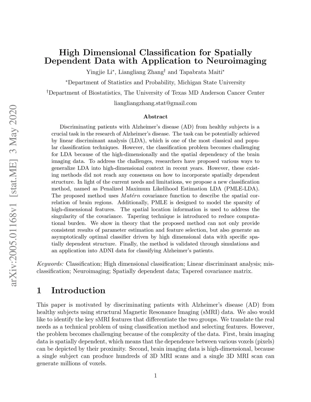 Discriminating patients with Alzheimer's disease (AD) from healthy subjects is a crucial task in the research of Alzheimer's disease. The task can be potentially achieved by linear discriminant analysis (LDA), which is one of the most classical and popular classification techniques. However, the classification problem becomes challenging for LDA because of the high-dimensionally and the spatial dependency of the brain imaging data. To address the challenges, researchers have proposed various ways to generalize LDA into high-dimensional context in recent years. However, these existing methods did not reach any consensus on how to incorporate spatially dependent structure. In light of the current needs and limitations, we propose a new classification method, named as Penalized Maximum Likelihood Estimation LDA (PMLE-LDA). The proposed method uses covariance function to describe the spatial correlation of brain regions. Additionally, PMLE is designed to model the sparsity of high-dimensional features. The spatial location information is used to address the singularity of the covariance. Tapering technique is introduced to reduce computational burden. We show in theory that the proposed method can not only provide consistent results of parameter estimation and feature selection, but also generate an asymptotically optimal classifier driven by high dimensional data with specific spatially dependent structure. Finally, the method is validated through simulations and an application into ADNI data for classifying Alzheimer's patients.