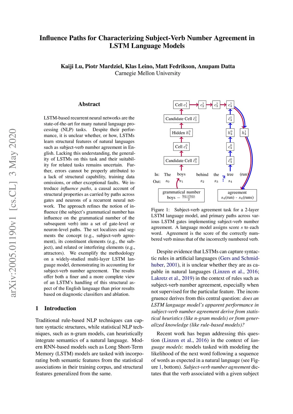 LSTM-based recurrent neural networks are the state-of-the-art for many natural language processing (NLP) tasks. Despite their performance, it is unclear whether, or how, LSTMs learn structural features of natural languages such as subject-verb number agreement in English. Lacking this understanding, the generality of LSTM performance on this task and their suitability for related tasks remains uncertain. Further, errors cannot be properly attributed to a lack of structural capability, training data omissions, or other exceptional faults. We introduce *influence paths*, a causal account of structural properties as carried by paths across gates and neurons of a recurrent neural network. The approach refines the notion of influence (the subject's grammatical number has influence on the grammatical number of the subsequent verb) into a set of gate or neuron-level paths. The set localizes and segments the concept (e.g., subject-verb agreement), its constituent elements (e.g., the subject), and related or interfering elements (e.g., attractors). We exemplify the methodology on a widely-studied multi-layer LSTM language model, demonstrating its accounting for subject-verb number agreement. The results offer both a finer and a more complete view of an LSTM's handling of this structural aspect of the English language than prior results based on diagnostic classifiers and ablation.