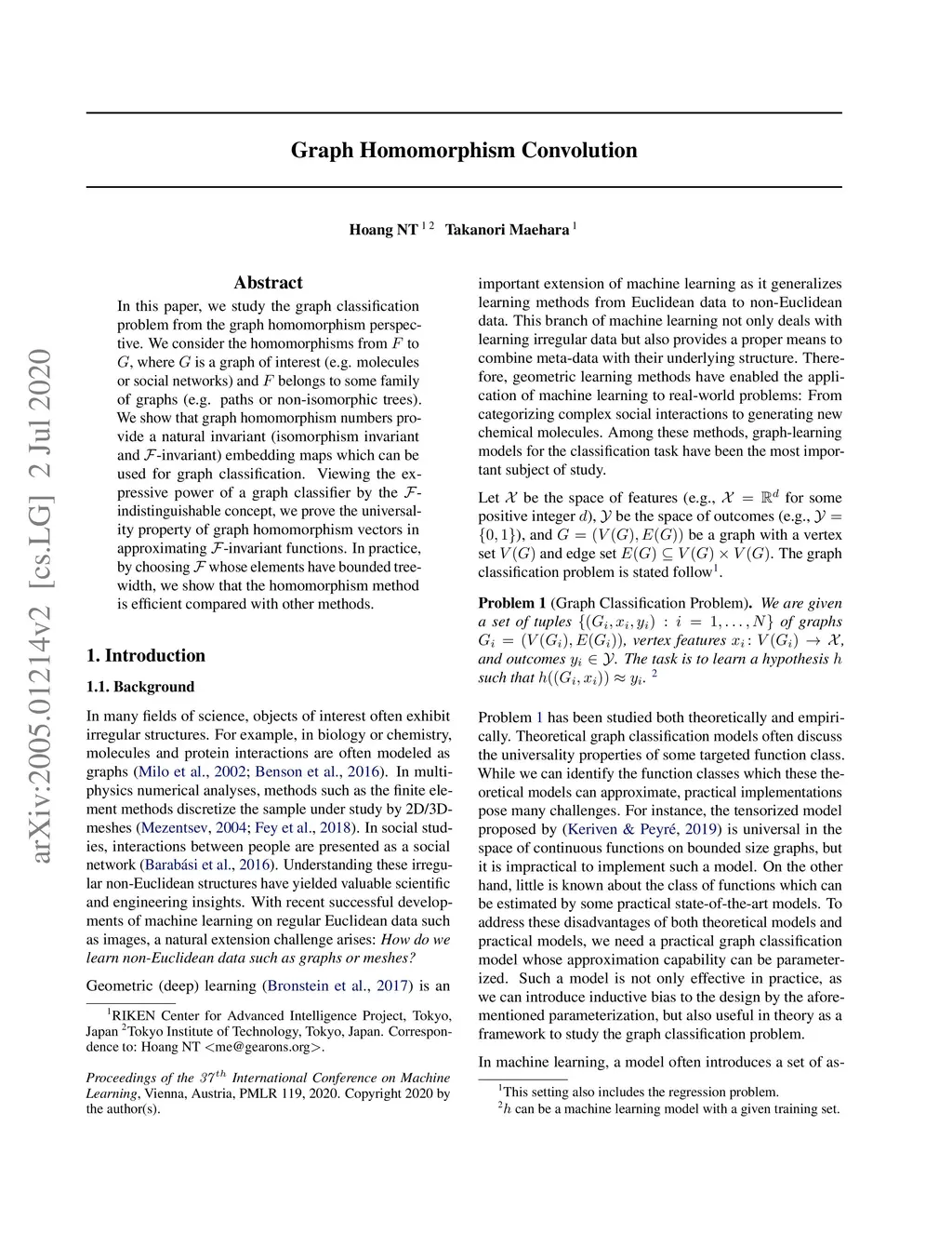 In this paper, we study the graph classification problem from the graph homomorphism perspective. We consider the homomorphisms from to , where is a graph of interest (e.g. molecules or social networks) and belongs to some family of graphs (e.g. paths or non-isomorphic trees). We show that graph homomorphism numbers provide a natural invariant (isomorphism invariant and -invariant) embedding maps which can be used for graph classification. Viewing the expressive power of a graph classifier by the -indistinguishable concept, we prove the universality property of graph homomorphism vectors in approximating -invariant functions. In practice, by choosing whose elements have bounded tree-width, we show that the homomorphism method is efficient compared with other methods.