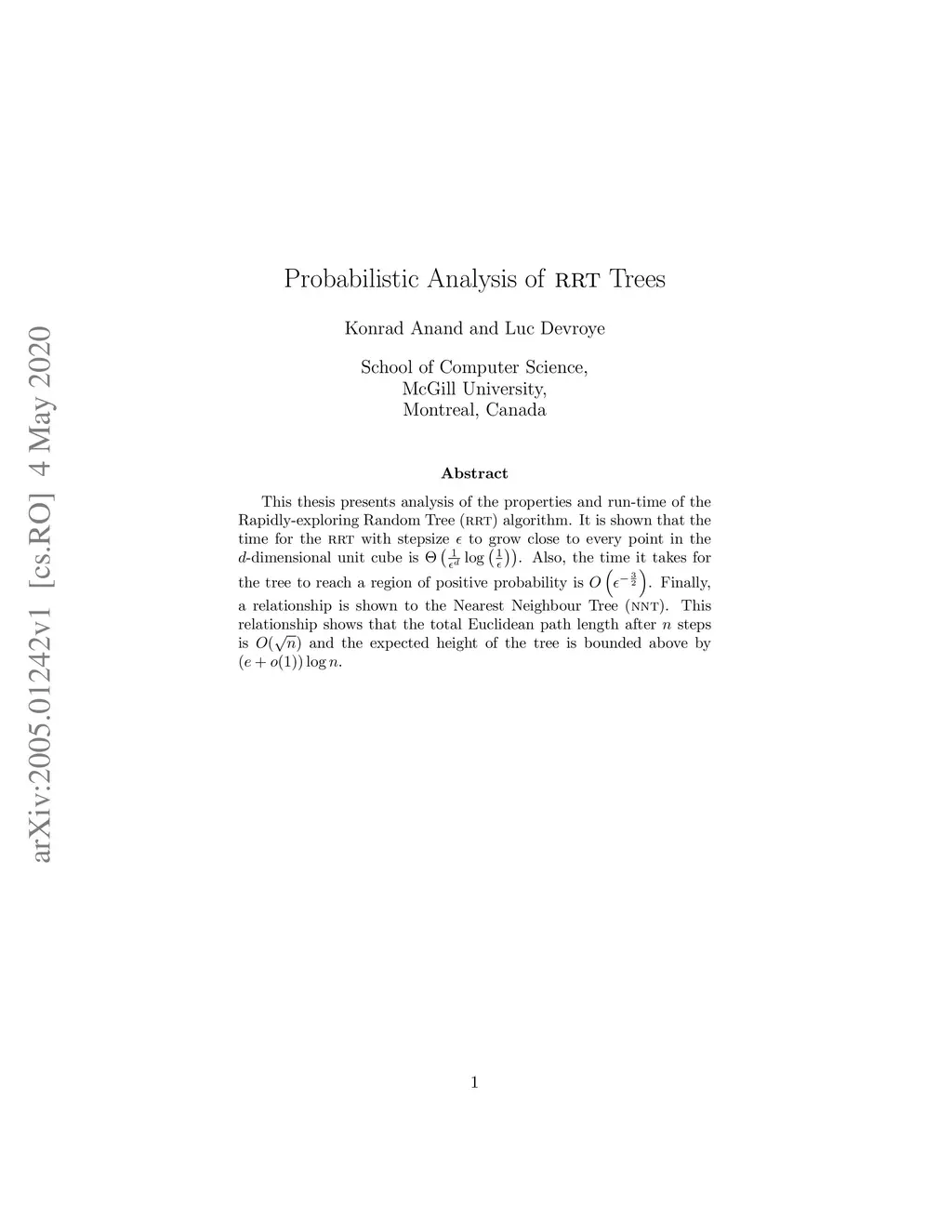This thesis presents analysis of the properties and run-time of the Rapidly-exploring Random Tree (RRT) algorithm. It is shown that the time for the RRT with stepsize to grow close to every point in the -dimensional unit cube is . Also, the time it takes for the tree to reach a region of positive probability is . Finally, a relationship is shown to the Nearest Neighbour Tree (NNT). This relationship shows that the total Euclidean path length after steps is and the expected height of the tree is bounded above by .