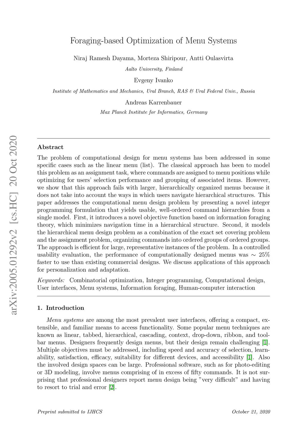 Computational design of menu systems has been solved in limited cases such as the linear menu (list) as an assignment task, where commands are assigned to menu positions while optimizing for for users selection performance and distance of associated items. We show that this approach falls short with larger, hierarchically organized menu systems, where one must also take into account how users navigate hierarchical structures. This paper presents a novel integer programming formulation that models hierarchical menus as a combination of the exact set covering problem and the assignment problem. It organizes commands into ordered groups of ordered groups via a novel objective function based on information foraging theory. It minimizes, on the one hand, the time required to select a command whose location is known from previous usage and, on the other, the time wasted in irrelevant parts of the menu while searching for commands whose location is not known. The convergence of these two factors yields usable, well-ordered command hierarchies from a single model. In generated menus, the lead (first) elements of a group or tab are good indicators of the remaining contents, thereby facilitating the search process. In a controlled usability evaluation, the performance of computationally designed menus was 25 faster than existing commercial designs with respect to selection time. The algorithm is efficient for large, representative instances of the problem. We further show applications in personalization and adaptation of menu systems.