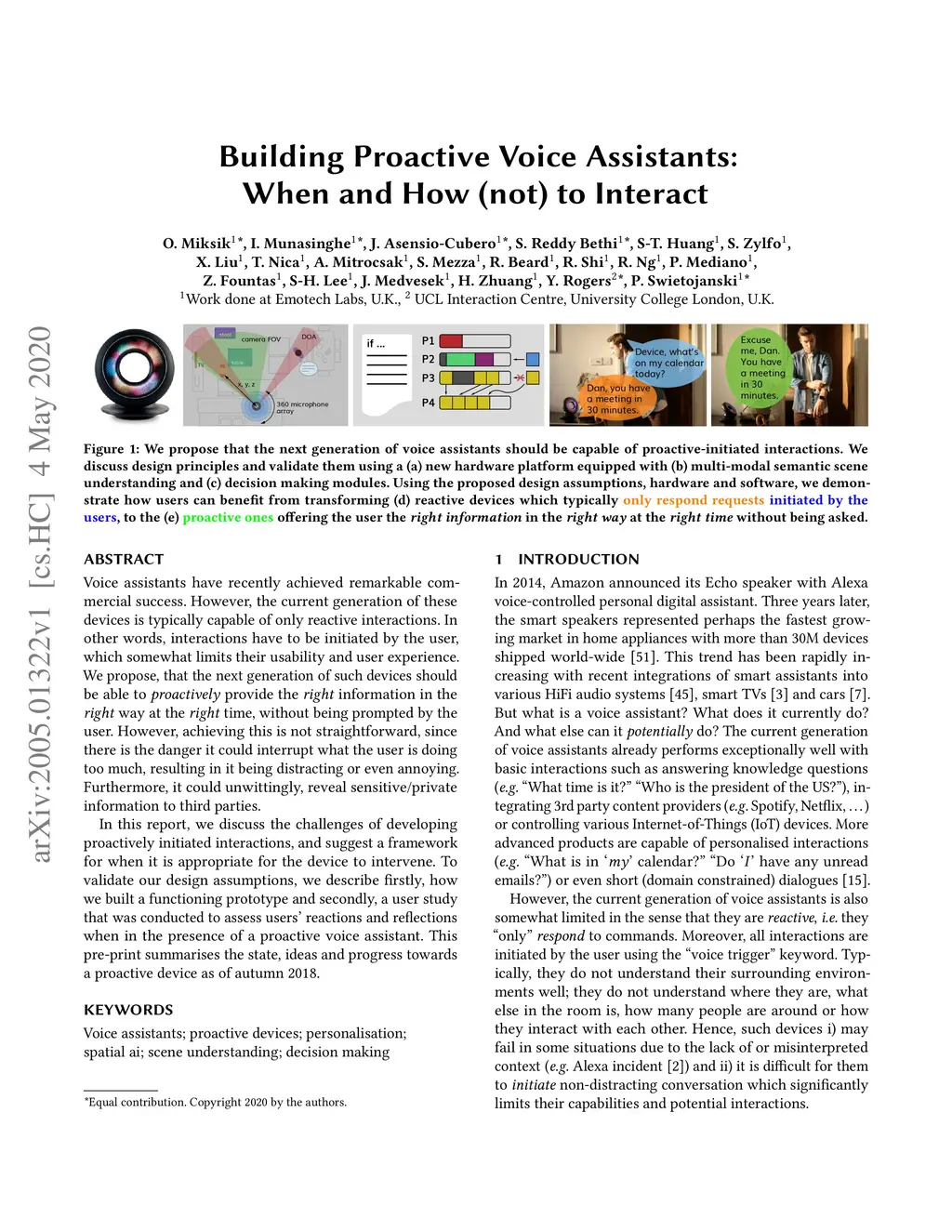 Voice assistants have recently achieved remarkable commercial success. However, the current generation of these devices is typically capable of only reactive interactions. In other words, interactions have to be initiated by the user, which somewhat limits their usability and user experience. We propose, that the next generation of such devices should be able to proactively provide the right information in the right way at the right time, without being prompted by the user. However, achieving this is not straightforward, since there is the danger it could interrupt what the user is doing too much, resulting in it being distracting or even annoying. Furthermore, it could unwittingly, reveal sensitive/private information to third parties. In this report, we discuss the challenges of developing proactively initiated interactions, and suggest a framework for when it is appropriate for the device to intervene. To validate our design assumptions, we describe firstly, how we built a functioning prototype and secondly, a user study that was conducted to assess users' reactions and reflections when in the presence of a proactive voice assistant. This pre-print summarises the state, ideas and progress towards a proactive device as of autumn 2018.