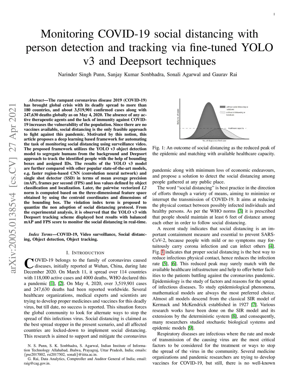 The rampant coronavirus disease 2019 (COVID-19) has brought global crisis with its deadly spread to more than 180 countries, and about 3,519,901 confirmed cases along with 247,630 deaths globally as on May 4, 2020. The absence of any active therapeutic agents and the lack of immunity against COVID-19 increases the vulnerability of the population. Since there are no vaccines available, social distancing is the only feasible approach to fight against this pandemic. Motivated by this notion, this article proposes a deep learning based framework for automating the task of monitoring social distancing using surveillance video. The proposed framework utilizes the YOLO v3 object detection model to segregate humans from the background and Deepsort approach to track the identified people with the help of bounding boxes and assigned IDs. The results of the YOLO v3 model are further compared with other popular state-of-the-art models, e.g. faster region-based CNN (convolution neural network) and single shot detector (SSD) in terms of mean average precision (mAP), frames per second (FPS) and loss values defined by object classification and localization. Later, the pairwise vectorized L2 norm is computed based on the three-dimensional feature space obtained by using the centroid coordinates and dimensions of the bounding box. The violation index term is proposed to quantize the non adoption of social distancing protocol. From the experimental analysis, it is observed that the YOLO v3 with Deepsort tracking scheme displayed best results with balanced mAP and FPS score to monitor the social distancing in real-time.