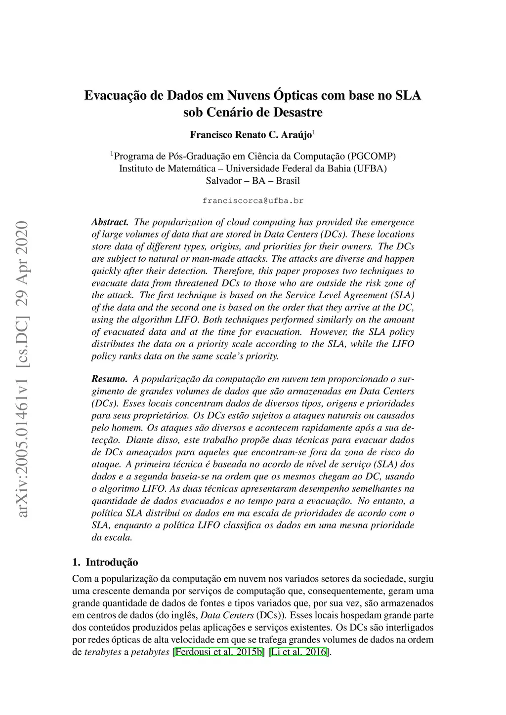 Evacuação de Dados em Nuvens Ópticas com base no SLA sob
