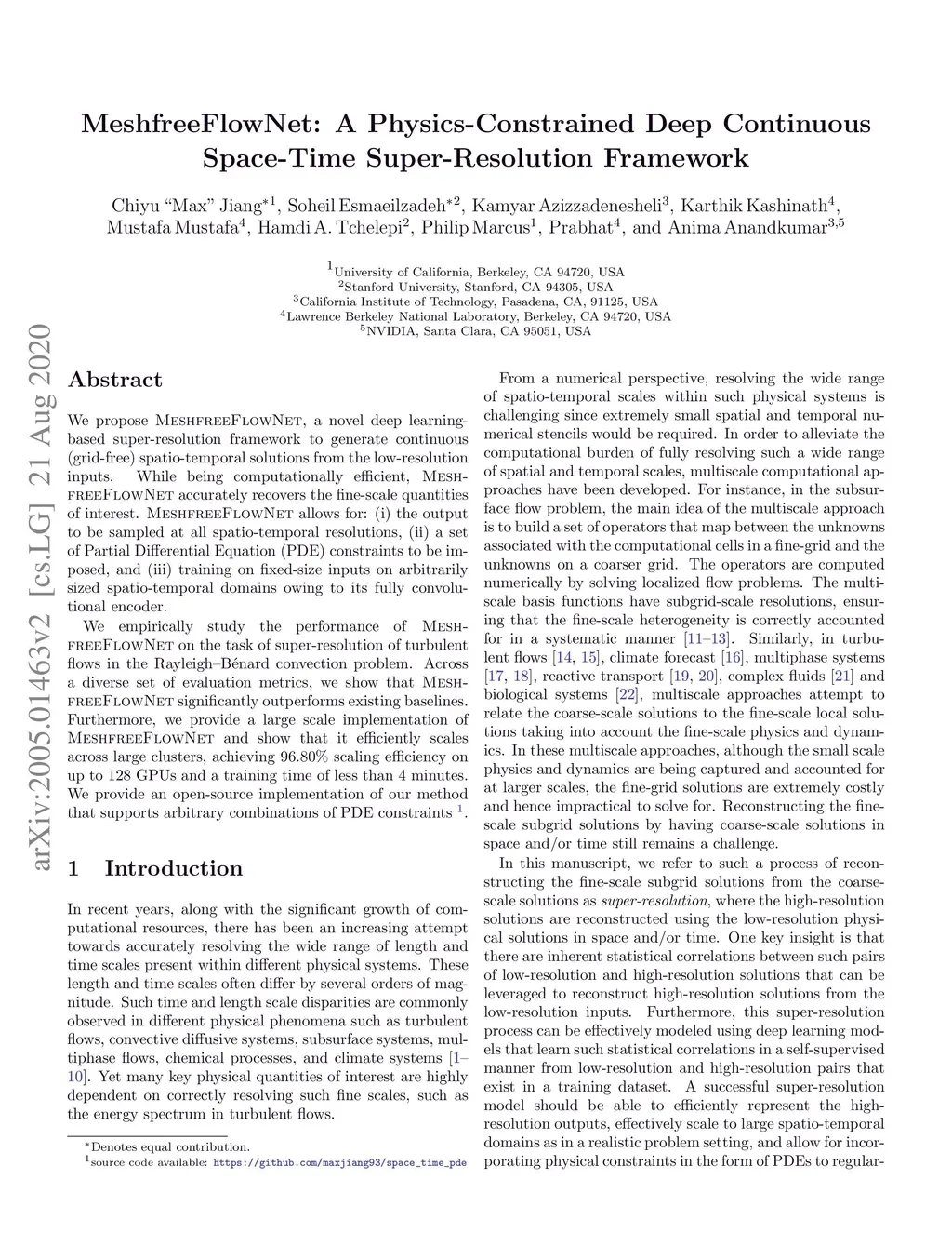 We propose MeshfreeFlowNet, a novel deep learning-based super-resolution framework to generate continuous (grid-free) spatio-temporal solutions from the low-resolution inputs. While being computationally efficient, MeshfreeFlowNet accurately recovers the fine-scale quantities of interest. MeshfreeFlowNet allows for: (i) the output to be sampled at all spatio-temporal resolutions, (ii) a set of Partial Differential Equation (PDE) constraints to be imposed, and (iii) training on fixed-size inputs on arbitrarily sized spatio-temporal domains owing to its fully convolutional encoder. We empirically study the performance of MeshfreeFlowNet on the task of super-resolution of turbulent flows in the Rayleigh-Benard convection problem. Across a diverse set of evaluation metrics, we show that MeshfreeFlowNet significantly outperforms existing baselines. Furthermore, we provide a large scale implementation of MeshfreeFlowNet and show that it efficiently scales across large clusters, achieving 96.80% scaling efficiency on up to 128 GPUs and a training time of less than 4 minutes.