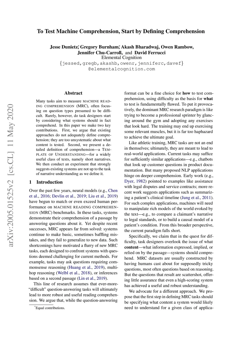 Many tasks aim to measure machine reading comprehension (MRC), often focusing on question types presumed to be difficult. Rarely, however, do task designers start by considering what systems should in fact comprehend. In this paper we make two key contributions. First, we argue that existing approaches do not adequately define comprehension; they are too unsystematic about what content is tested. Second, we present a detailed definition of comprehension -- a "Template of Understanding" -- for a widely useful class of texts, namely short narratives. We then conduct an experiment that strongly suggests existing systems are not up to the task of narrative understanding as we define it.