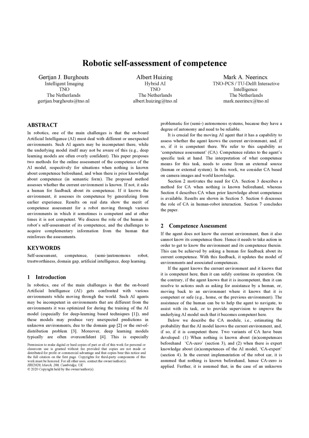 In robotics, one of the main challenges is that the on-board Artificial Intelligence (AI) must deal with different or unexpected environments. Such AI agents may be incompetent there, while the underlying model itself may not be aware of this (e.g., deep learning models are often overly confident). This paper proposes two methods for the online assessment of the competence of the AI model, respectively for situations when nothing is known about competence beforehand, and when there is prior knowledge about competence (in semantic form). The proposed method assesses whether the current environment is known. If not, it asks a human for feedback about its competence. If it knows the environment, it assesses its competence by generalizing from earlier experience. Results on real data show the merit of competence assessment for a robot moving through various environments in which it sometimes is competent and at other times it is not competent. We discuss the role of the human in robot's self-assessment of its competence, and the challenges to acquire complementary information from the human that reinforces the assessments.