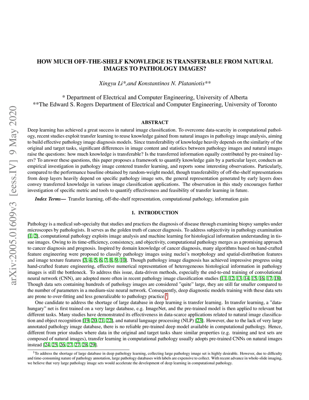 Deep learning has achieved a great success in natural image classification. To overcome data-scarcity in computational pathology, recent studies exploit transfer learning to reuse knowledge gained from natural images in pathology image analysis, aiming to build effective pathology image diagnosis models. Since transferability of knowledge heavily depends on the similarity of the original and target tasks, significant differences in image content and statistics between pathology images and natural images raise the questions: how much knowledge is transferable? Is the transferred information equally contributed by pre-trained layers? To answer these questions, this paper proposes a framework to quantify knowledge gain by a particular layer, conducts an empirical investigation in pathology image centered transfer learning, and reports some interesting observations. Particularly, compared to the performance baseline obtained by random-weight model, though transferability of off-the-shelf representations from deep layers heavily depend on specific pathology image sets, the general representation generated by early layers does convey transferred knowledge in various image classification applications. The observation in this study encourages further investigation of specific metric and tools to quantify effectiveness and feasibility of transfer learning in future.