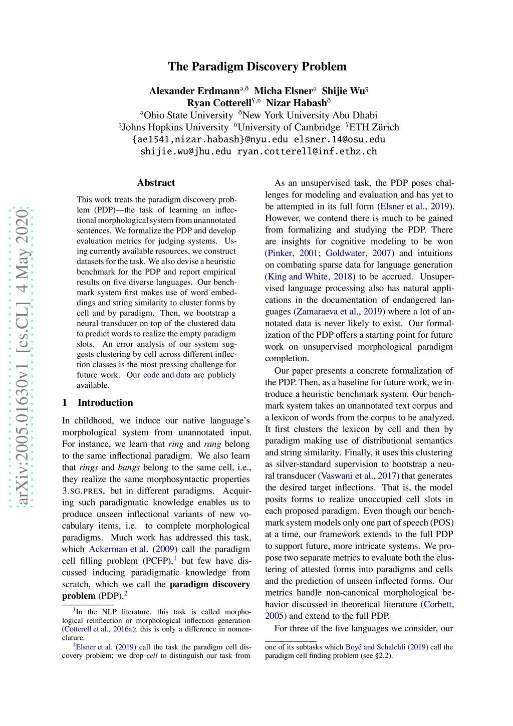 This work treats the paradigm discovery problem (PDP), the task of learning an inflectional morphological system from unannotated sentences. We formalize the PDP and develop evaluation metrics for judging systems. Using currently available resources, we construct datasets for the task. We also devise a heuristic benchmark for the PDP and report empirical results on five diverse languages. Our benchmark system first makes use of word embeddings and string similarity to cluster forms by cell and by paradigm. Then, we bootstrap a neural transducer on top of the clustered data to predict words to realize the empty paradigm slots. An error analysis of our system suggests clustering by cell across different inflection classes is the most pressing challenge for future work. Our code and data are available for public use.