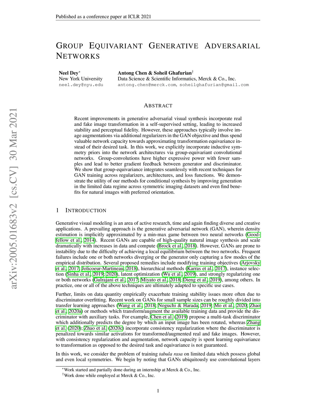 Recent improvements in generative adversarial visual synthesis incorporate real and fake image transformation in a self-supervised setting, leading to increased stability and perceptual fidelity. However, these approaches typically involve image augmentations via additional regularizers in the GAN objective and thus spend valuable network capacity towards approximating transformation equivariance instead of their desired task. In this work, we explicitly incorporate inductive symmetry priors into the network architectures via group-equivariant convolutional networks. Group-convolutions have higher expressive power with fewer samples and lead to better gradient feedback between generator and discriminator. We show that group-equivariance integrates seamlessly with recent techniques for GAN training across regularizers, architectures, and loss functions. We demonstrate the utility of our methods for conditional synthesis by improving generation in the limited data regime across symmetric imaging datasets and even find benefits for natural images with preferred orientation.