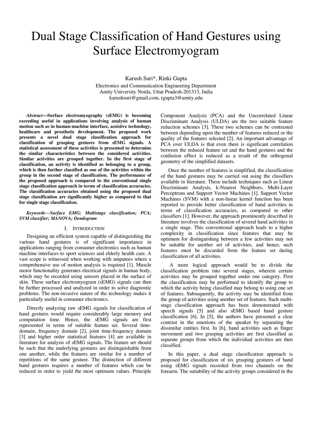 Dual Stage Classification of Hand Gestures using Surface Electromyogram