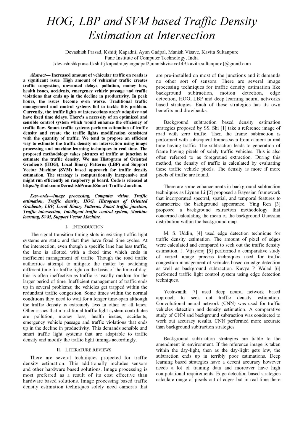 Increased amount of vehicular traffic on roads is a significant issue. High amount of vehicular traffic creates traffic congestion, unwanted delays, pollution, money loss, health issues, accidents, emergency vehicle passage and traffic violations that ends up in the decline in productivity. In peak hours, the issues become even worse. Traditional traffic management and control systems fail to tackle this problem. Currently, the traffic lights at intersections aren't adaptive and have fixed time delays. There's a necessity of an optimized and sensible control system which would enhance the efficiency of traffic flow. Smart traffic systems perform estimation of traffic density and create the traffic lights modification consistent with the quantity of traffic. We tend to propose an efficient way to estimate the traffic density on intersection using image processing and machine learning techniques in real time. The proposed methodology takes pictures of traffic at junction to estimate the traffic density. We use Histogram of Oriented Gradients (HOG), Local Binary Patterns (LBP) and Support Vector Machine (SVM) based approach for traffic density estimation. The strategy is computationally inexpensive and can run efficiently on raspberry pi board. Code is released at https://github.com/DevashishPrasad/Smart-Traffic-Junction.