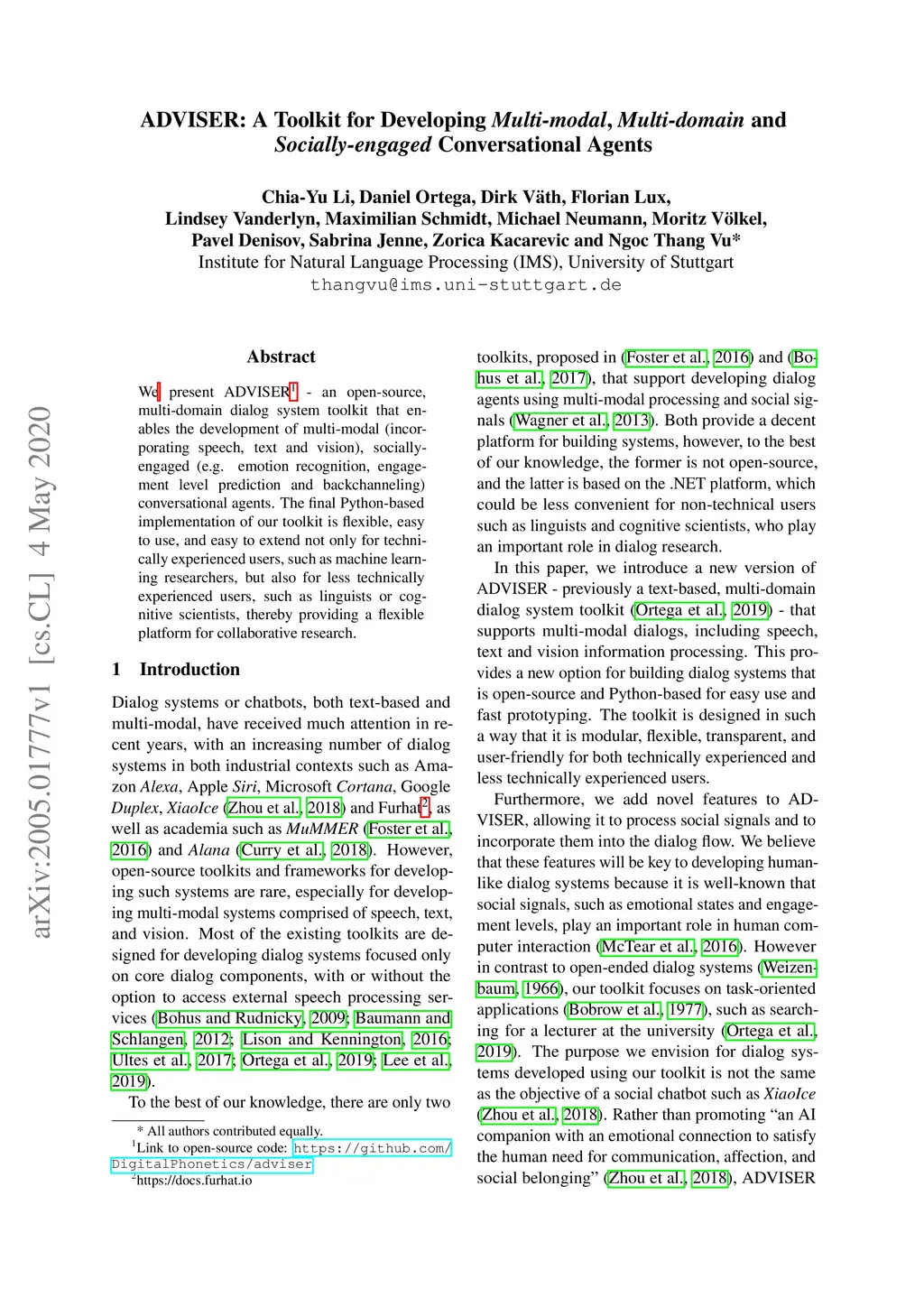 We present ADVISER - an open-source, multi-domain dialog system toolkit that enables the development of multi-modal (incorporating speech, text and vision), socially-engaged (e.g. emotion recognition, engagement level prediction and backchanneling) conversational agents. The final Python-based implementation of our toolkit is flexible, easy to use, and easy to extend not only for technically experienced users, such as machine learning researchers, but also for less technically experienced users, such as linguists or cognitive scientists, thereby providing a flexible platform for collaborative research. Link to open-source code: https://github.com/DigitalPhonetics/adviser