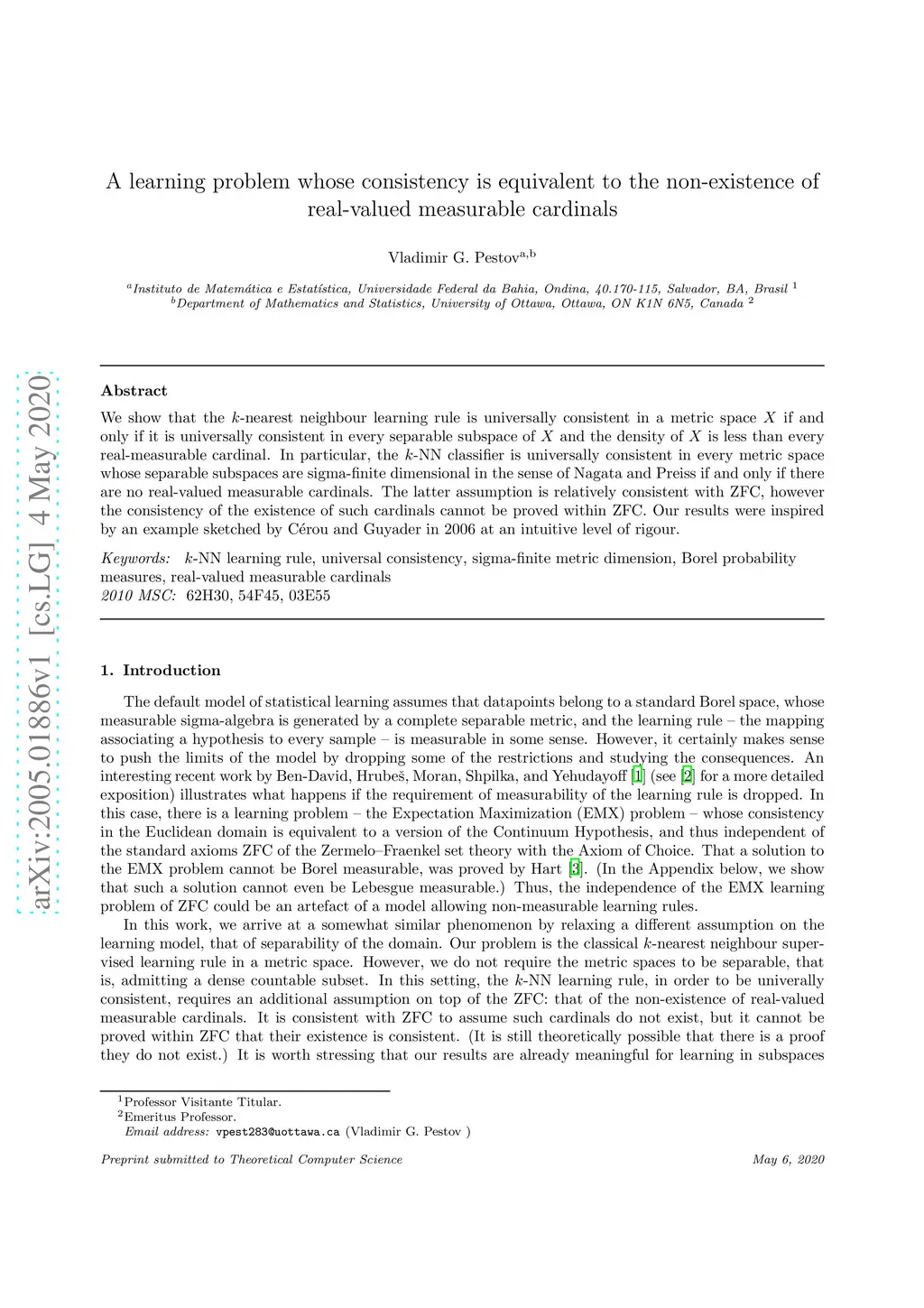 We show that the -nearest neighbour learning rule is universally consistent in a metric space if and only if it is universally consistent in every separable subspace of and the density of is less than every real-measurable cardinal. In particular, the -NN classifier is universally consistent in every metric space whose separable subspaces are sigma-finite dimensional in the sense of Nagata and Preiss if and only if there are no real-valued measurable cardinals. The latter assumption is relatively consistent with ZFC, however the consistency of the existence of such cardinals cannot be proved within ZFC. Our results were inspired by an example sketched by C\érou and Guyader in 2006 at an intuitive level of rigour.