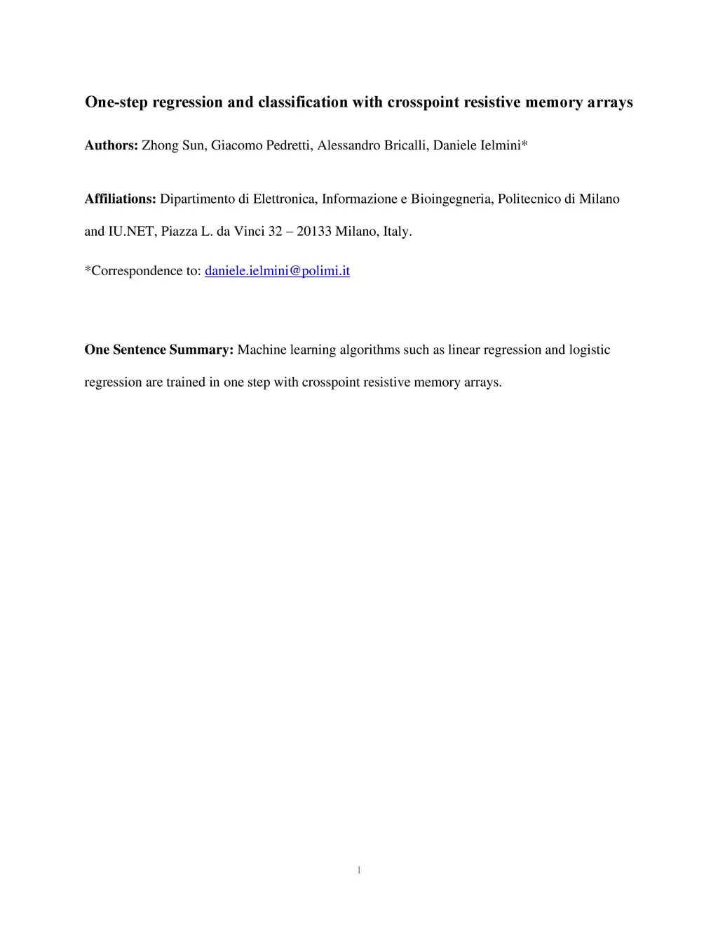 Machine learning has been getting a large attention in the recent years, as a tool to process big data generated by ubiquitous sensors in our daily life. High speed, low energy computing machines are in demand to enable real-time artificial intelligence at the edge, i.e., without the support of a remote frame server in the cloud. Such requirements challenge the complementary metal-oxide-semiconductor (CMOS) technology, which is limited by the Moore's law approaching its end and the communication bottleneck in conventional computing architecture. Novel computing concepts, architectures and devices are thus strongly needed to accelerate data-intensive applications. Here we show a crosspoint resistive memory circuit with feedback configuration can execute linear regression and logistic regression in just one step by computing the pseudoinverse matrix of the data within the memory. The most elementary learning operation, that is the regression of a sequence of data and the classification of a set of data, can thus be executed in one single computational step by the novel technology. One-step learning is further supported by simulations of the prediction of the cost of a house in Boston and the training of a 2-layer neural network for MNIST digit recognition. The results are all obtained in one computational step, thanks to the physical, parallel, and analog computing within the crosspoint array.