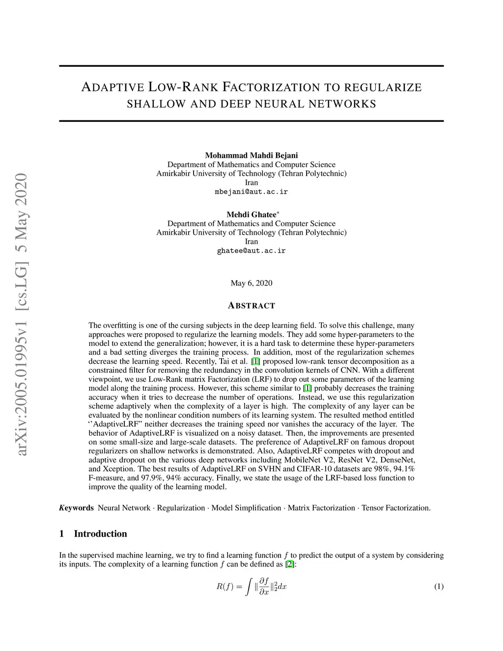 The overfitting is one of the cursing subjects in the deep learning field. To solve this challenge, many approaches were proposed to regularize the learning models. They add some hyper-parameters to the model to extend the generalization; however, it is a hard task to determine these hyper-parameters and a bad setting diverges the training process. In addition, most of the regularization schemes decrease the learning speed. Recently, Tai et al. [1] proposed low-rank tensor decomposition as a constrained filter for removing the redundancy in the convolution kernels of CNN. With a different viewpoint, we use Low-Rank matrix Factorization (LRF) to drop out some parameters of the learning model along the training process. However, this scheme similar to [1] probably decreases the training accuracy when it tries to decrease the number of operations. Instead, we use this regularization scheme adaptively when the complexity of a layer is high. The complexity of any layer can be evaluated by the nonlinear condition numbers of its learning system. The resulted method entitled "AdaptiveLRF" neither decreases the training speed nor vanishes the accuracy of the layer. The behavior of AdaptiveLRF is visualized on a noisy dataset. Then, the improvements are presented on some small-size and large-scale datasets. The preference of AdaptiveLRF on famous dropout regularizers on shallow networks is demonstrated. Also, AdaptiveLRF competes with dropout and adaptive dropout on the various deep networks including MobileNet V2, ResNet V2, DenseNet, and Xception. The best results of AdaptiveLRF on SVHN and CIFAR-10 datasets are 98%, 94.1% F-measure, and 97.9%, 94% accuracy. Finally, we state the usage of the LRF-based loss function to improve the quality of the learning model.