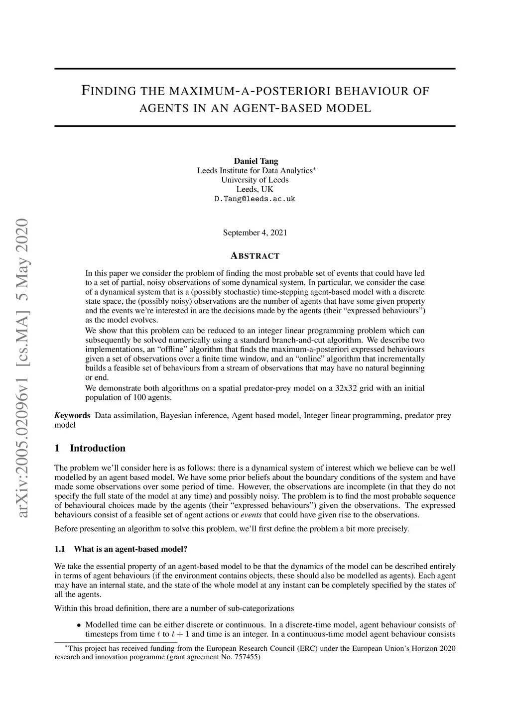 In this paper we consider the problem of finding the most probable set of events that could have led to a set of partial, noisy observations of some dynamical system. In particular, we consider the case of a dynamical system that is a (possibly stochastic) time-stepping agent-based model with a discrete state space, the (possibly noisy) observations are the number of agents that have some given property and the events we're interested in are the decisions made by the agents (their ``expressed behaviours'') as the model evolves. We show that this problem can be reduced to an integer linear programming problem which can subsequently be solved numerically using a standard branch-and-cut algorithm. We describe two implementations, an ``offline'' algorithm that finds the maximum-a-posteriori expressed behaviours given a set of observations over a finite time window, and an ``online'' algorithm that incrementally builds a feasible set of behaviours from a stream of observations that may have no natural beginning or end. We demonstrate both algorithms on a spatial predator-prey model on a 32x32 grid with an initial population of 100 agents.