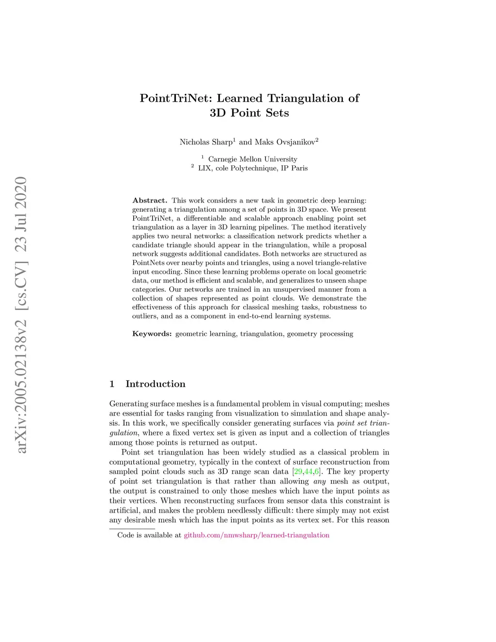 PointTriNet: Learned Triangulation of 3D Point Sets