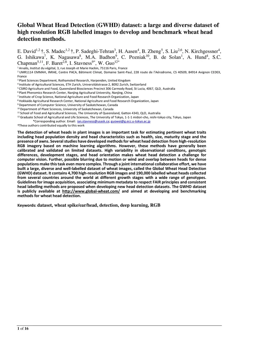 Global Wheat Head Detection (GWHD) dataset: a large and diverse dataset