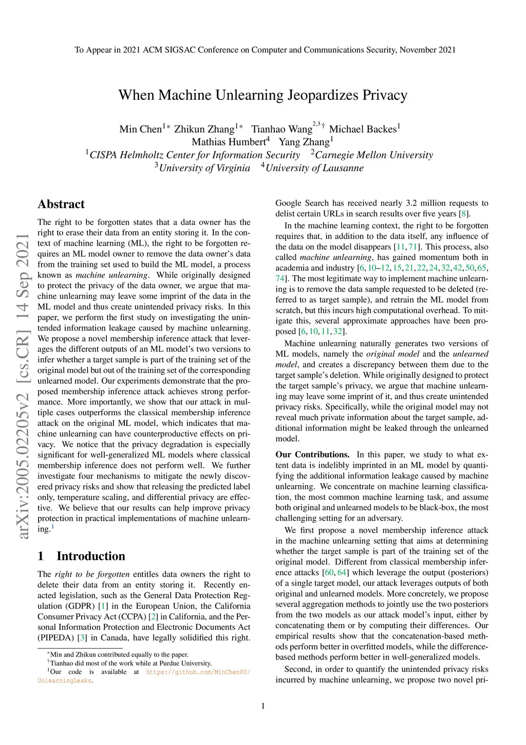 The right to be forgotten states that a data owner has the right to erase their data from an entity storing it. In the context of machine learning (ML), the right to be forgotten requires an ML model owner to remove the data owner's data from the training set used to build the ML model, a process known as machine unlearning. While originally designed to protect the privacy of the data owner, we argue that machine unlearning may leave some imprint of the data in the ML model and thus create unintended privacy risks. In this paper, we perform the first study on investigating the unintended information leakage caused by machine unlearning. We propose a novel membership inference attack that leverages the different outputs of an ML model's two versions to infer whether a target sample is part of the training set of the original model but out of the training set of the corresponding unlearned model. Our experiments demonstrate that the proposed membership inference attack achieves strong performance. More importantly, we show that our attack in multiple cases outperforms the classical membership inference attack on the original ML model, which indicates that machine unlearning can have counterproductive effects on privacy. We notice that the privacy degradation is especially significant for well-generalized ML models where classical membership inference does not perform well. We further investigate four mechanisms to mitigate the newly discovered privacy risks and show that releasing the predicted label only, temperature scaling, and differential privacy are effective. We believe that our results can help improve privacy protection in practical implementations of machine unlearning. Our code is available at https://github.com/MinChen00/UnlearningLeaks.