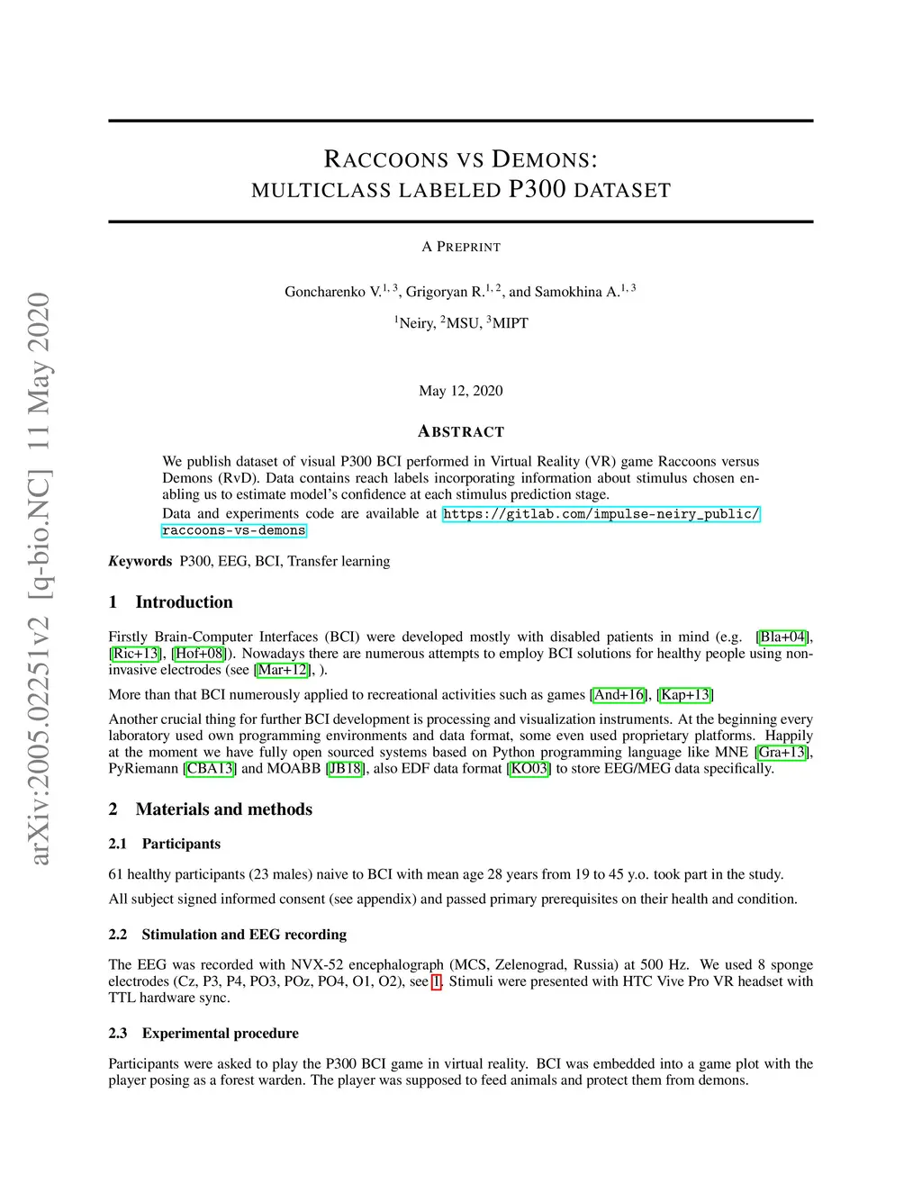 We publish dataset of visual P300 BCI performed in Virtual Reality (VR) game Raccoons versus Demons (RvD). Data contains reach labels incorporating information about stimulus chosen enabling us to estimate model's confidence at each stimulus prediction stage. Data and experiments code are available at https://gitlab.com/impulse-neiry_public/raccoons-vs-demons