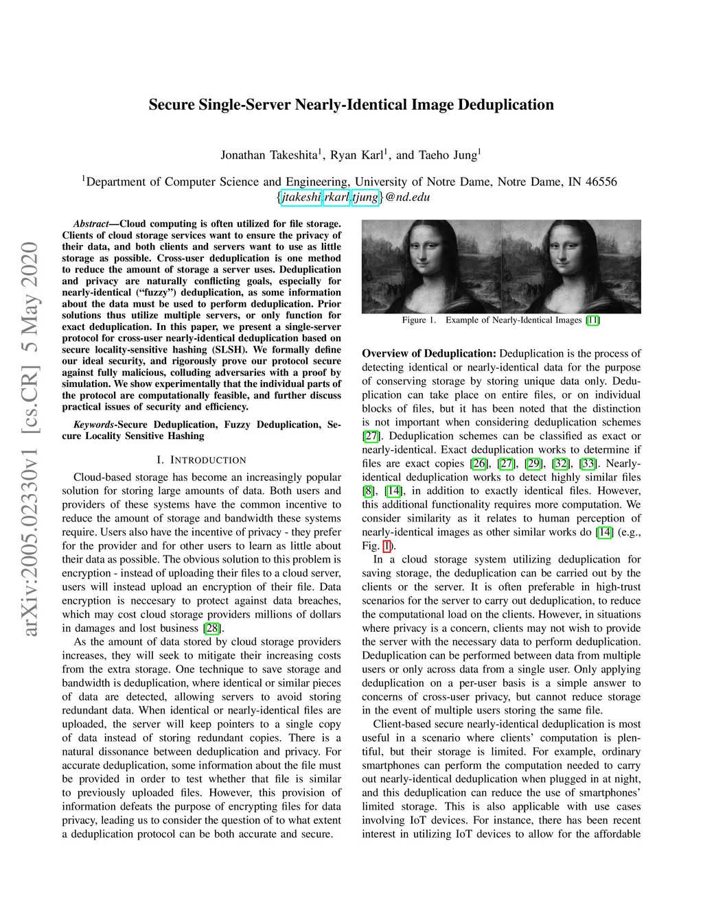 Cloud computing is often utilized for file storage. Clients of cloud storage services want to ensure the privacy of their data, and both clients and servers want to use as little storage as possible. Cross-user deduplication is one method to reduce the amount of storage a server uses. Deduplication and privacy are naturally conflicting goals, especially for nearly-identical (``fuzzy'') deduplication, as some information about the data must be used to perform deduplication. Prior solutions thus utilize multiple servers, or only function for exact deduplication. In this paper, we present a single-server protocol for cross-user nearly-identical deduplication based on secure locality-sensitive hashing (SLSH). We formally define our ideal security, and rigorously prove our protocol secure against fully malicious, colluding adversaries with a proof by simulation. We show experimentally that the individual parts of the protocol are computationally feasible, and further discuss practical issues of security and efficiency.