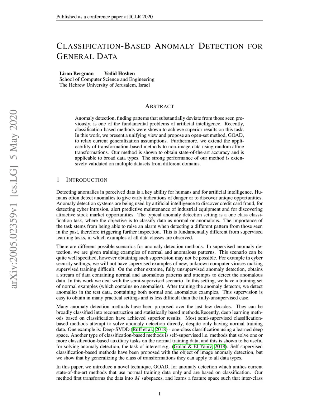 Anomaly detection, finding patterns that substantially deviate from those seen previously, is one of the fundamental problems of artificial intelligence. Recently, classification-based methods were shown to achieve superior results on this task. In this work, we present a unifying view and propose an open-set method, GOAD, to relax current generalization assumptions. Furthermore, we extend the applicability of transformation-based methods to non-image data using random affine transformations. Our method is shown to obtain state-of-the-art accuracy and is applicable to broad data types. The strong performance of our method is extensively validated on multiple datasets from different domains.