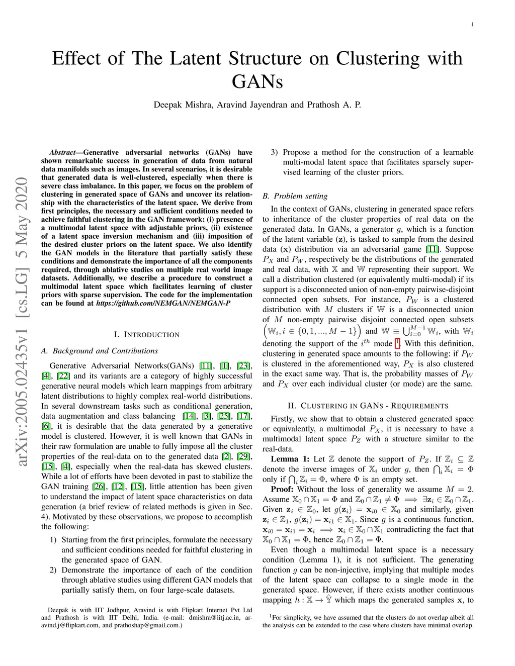 Generative adversarial networks (GANs) have shown remarkable success in generation of data from natural data manifolds such as images. In several scenarios, it is desirable that generated data is well-clustered, especially when there is severe class imbalance. In this paper, we focus on the problem of clustering in generated space of GANs and uncover its relationship with the characteristics of the latent space. We derive from first principles, the necessary and sufficient conditions needed to achieve faithful clustering in the GAN framework: (i) presence of a multimodal latent space with adjustable priors, (ii) existence of a latent space inversion mechanism and (iii) imposition of the desired cluster priors on the latent space. We also identify the GAN models in the literature that partially satisfy these conditions and demonstrate the importance of all the components required, through ablative studies on multiple real world image datasets. Additionally, we describe a procedure to construct a multimodal latent space which facilitates learning of cluster priors with sparse supervision.
