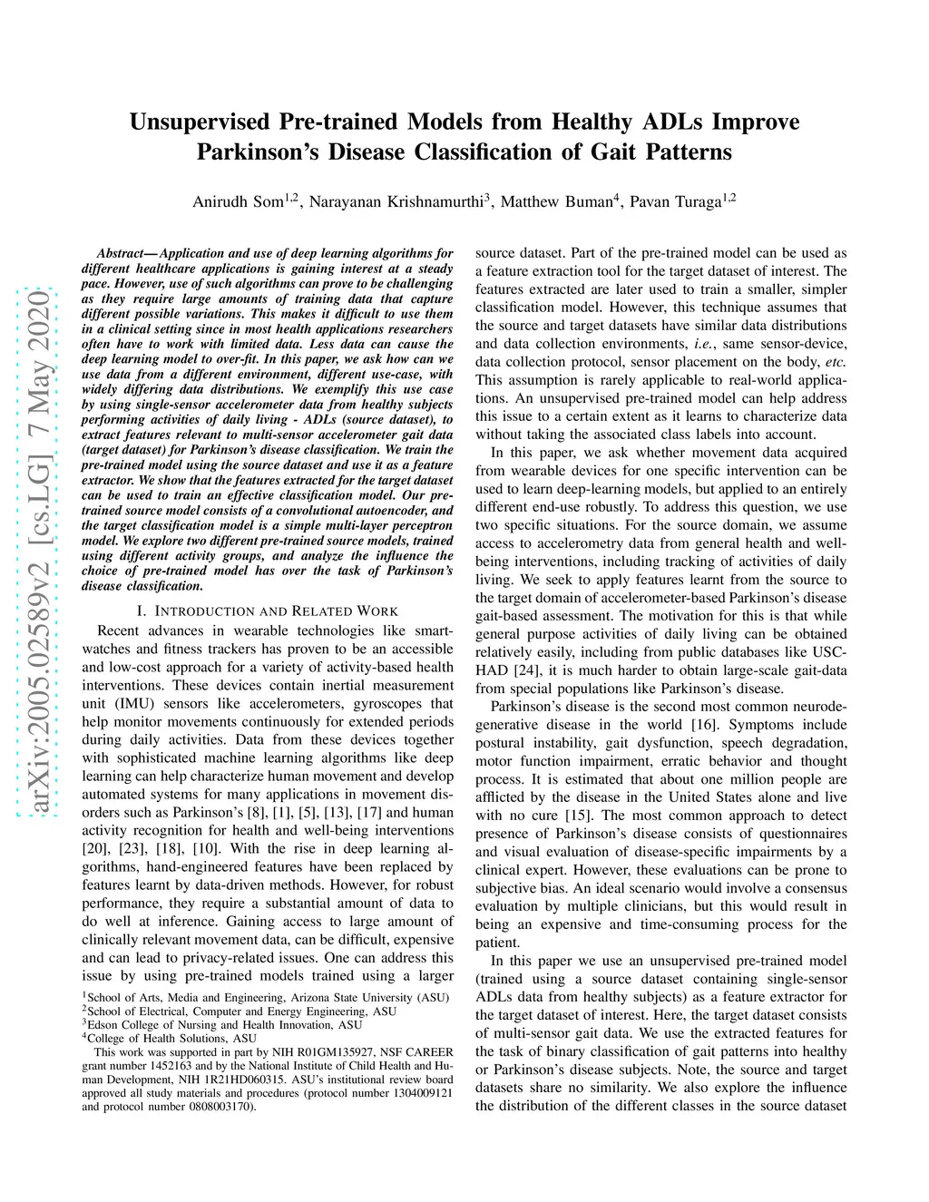 Application and use of deep learning algorithms for different healthcare applications is gaining interest at a steady pace. However, use of such algorithms can prove to be challenging as they require large amounts of training data that capture different possible variations. This makes it difficult to use them in a clinical setting since in most health applications researchers often have to work with limited data. Less data can cause the deep learning model to over-fit. In this paper, we ask how can we use data from a different environment, different use-case, with widely differing data distributions. We exemplify this use case by using single-sensor accelerometer data from healthy subjects performing activities of daily living - ADLs (source dataset), to extract features relevant to multi-sensor accelerometer gait data (target dataset) for Parkinson's disease classification. We train the pre-trained model using the source dataset and use it as a feature extractor. We show that the features extracted for the target dataset can be used to train an effective classification model. Our pre-trained source model consists of a convolutional autoencoder, and the target classification model is a simple multi-layer perceptron model. We explore two different pre-trained source models, trained using different activity groups, and analyze the influence the choice of pre-trained model has over the task of Parkinson's disease classification.