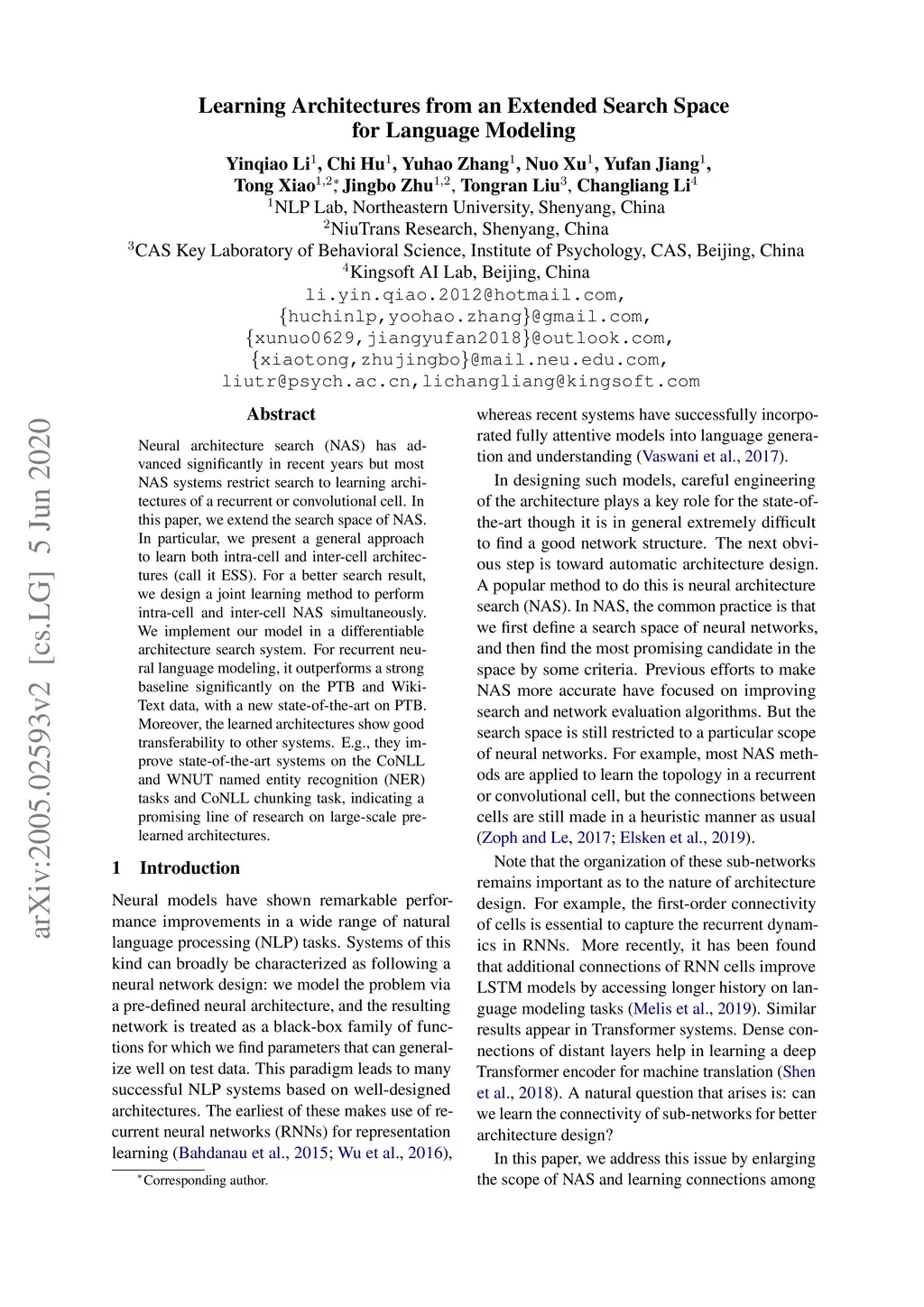 Neural architecture search (NAS) has advanced significantly in recent years but most NAS systems restrict search to learning architectures of a recurrent or convolutional cell. In this paper, we extend the search space of NAS. In particular, we present a general approach to learn both intra-cell and inter-cell architectures (call it ESS). For a better search result, we design a joint learning method to perform intra-cell and inter-cell NAS simultaneously. We implement our model in a differentiable architecture search system. For recurrent neural language modeling, it outperforms a strong baseline significantly on the PTB and WikiText data, with a new state-of-the-art on PTB. Moreover, the learned architectures show good transferability to other systems. E.g., they improve state-of-the-art systems on the CoNLL and WNUT named entity recognition (NER) tasks and CoNLL chunking task, indicating a promising line of research on large-scale pre-learned architectures.