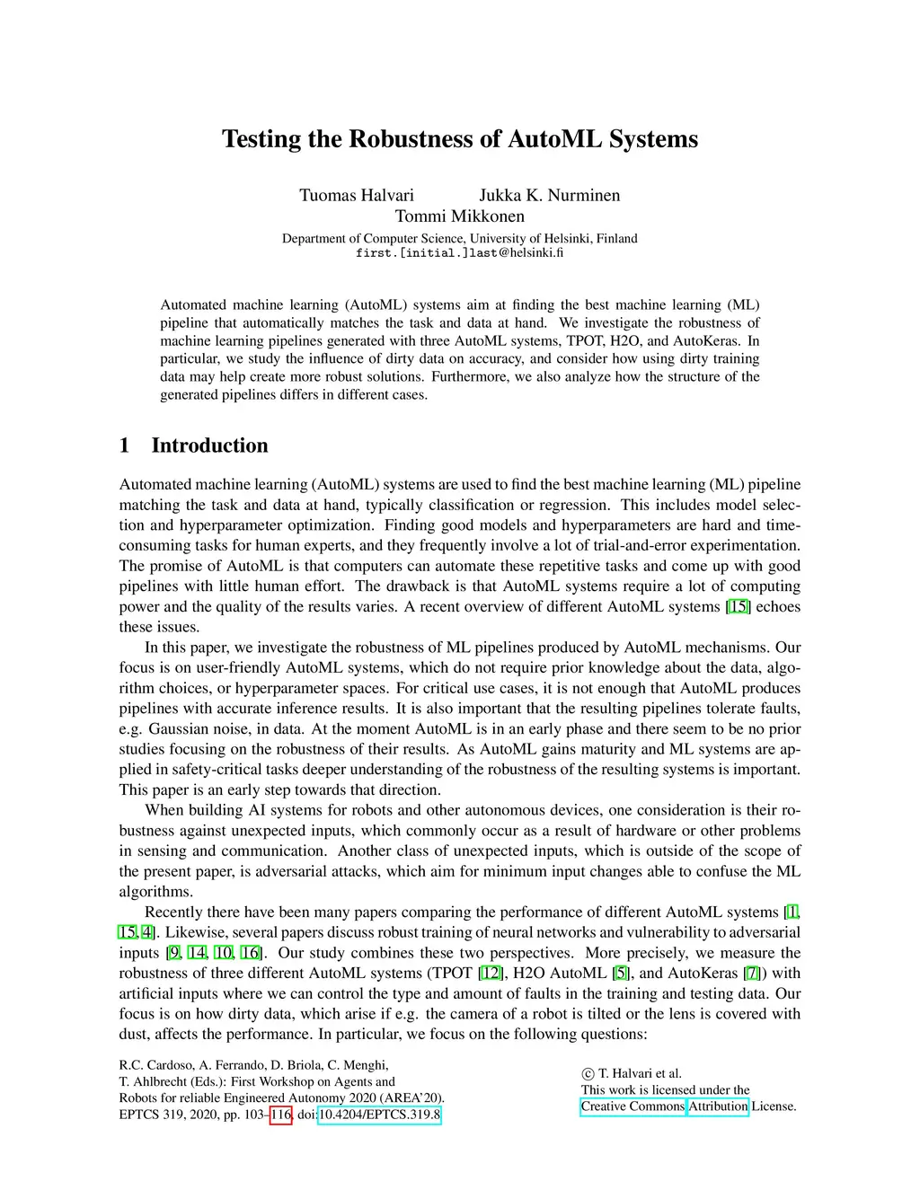 Automated machine learning (AutoML) systems aim at finding the best machine learning (ML) pipeline that automatically matches the task and data at hand. We investigate the robustness of machine learning pipelines generated with three AutoML systems, TPOT, H2O, and AutoKeras. In particular, we study the influence of dirty data on accuracy, and consider how using dirty training data may help create more robust solutions. Furthermore, we also analyze how the structure of the generated pipelines differs in different cases.