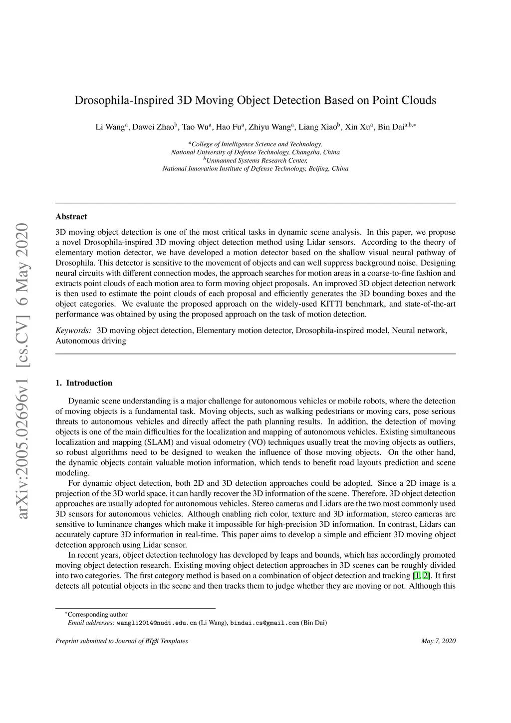 Drosophila-Inspired 3D Moving Object Detection Based on Point Clouds