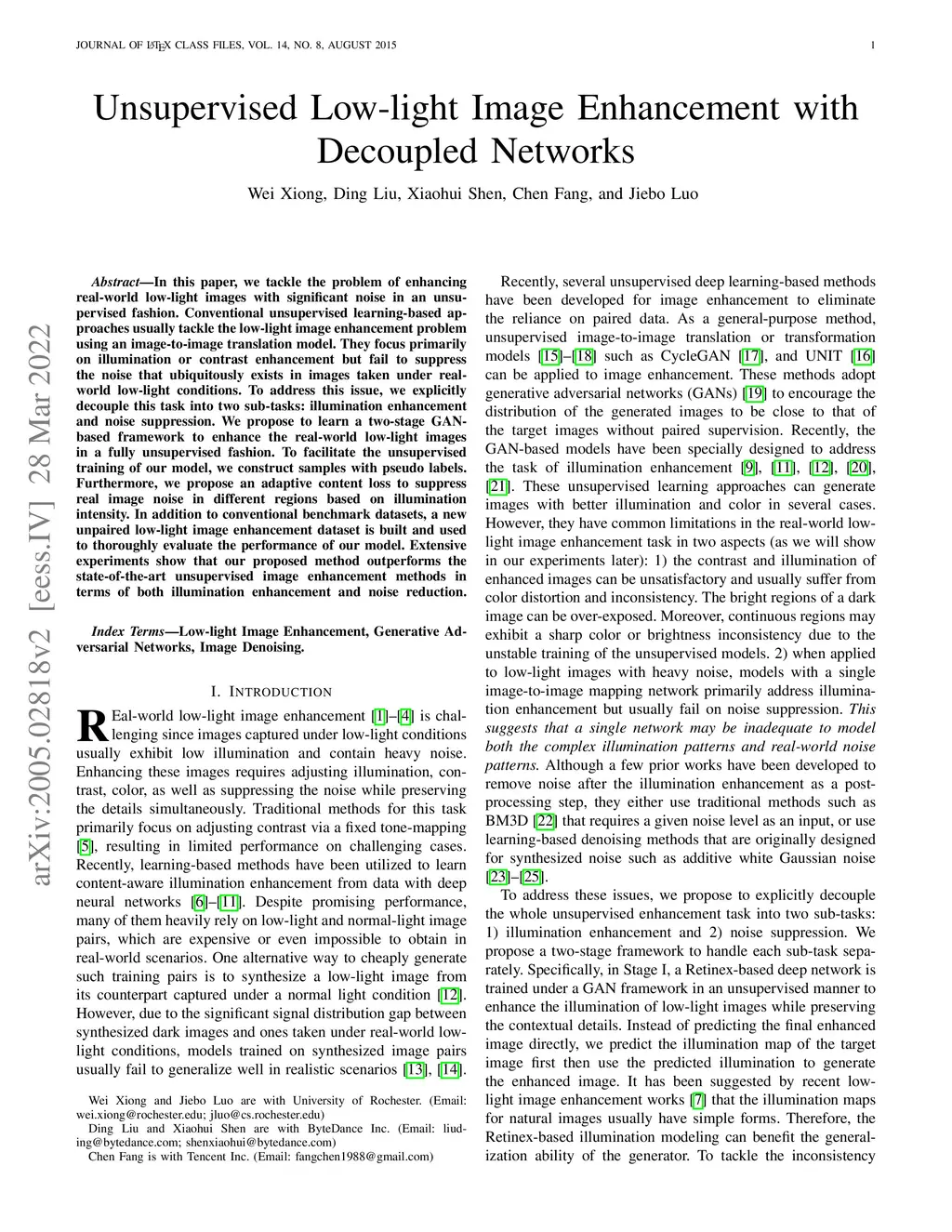 Unsupervised Low-light Image Enhancement with Decoupled Networks
