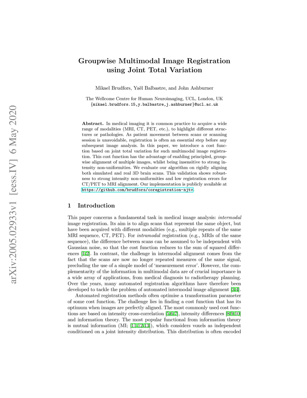 In medical imaging it is common practice to acquire a wide range of modalities (MRI, CT, PET, etc.), to highlight different structures or pathologies. As patient movement between scans or scanning session is unavoidable, registration is often an essential step before any subsequent image analysis. In this paper, we introduce a cost function based on joint total variation for such multimodal image registration. This cost function has the advantage of enabling principled, groupwise alignment of multiple images, whilst being insensitive to strong intensity non-uniformities. We evaluate our algorithm on rigidly aligning both simulated and real 3D brain scans. This validation shows robustness to strong intensity non-uniformities and low registration errors for CT/PET to MRI alignment. Our implementation is publicly available at https://github.com/brudfors/coregistration-njtv.