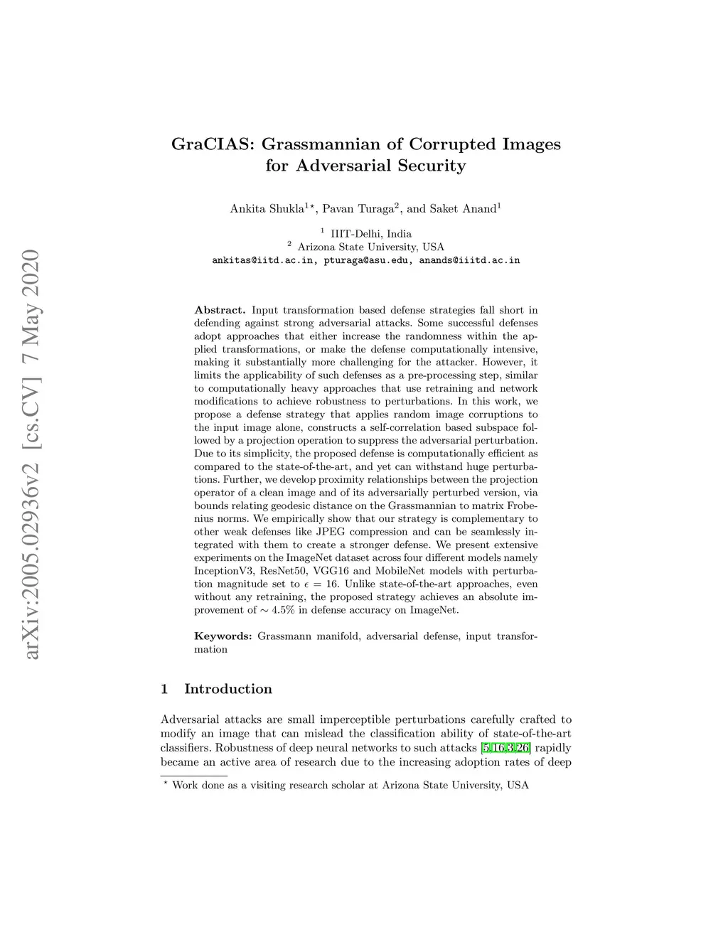 GraCIAS: Grassmannian of Corrupted Images for Adversarial Security