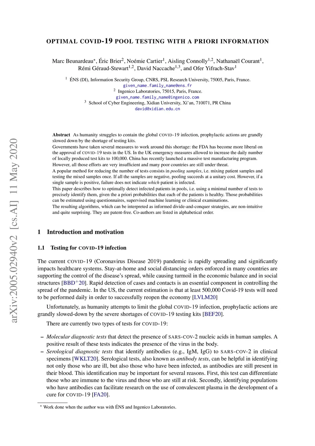 As humanity struggles to contain the global Covid-19 infection, prophylactic actions are grandly slowed down by the shortage of testing kits. Governments have taken several measures to work around this shortage: the FDA has become more liberal on the approval of Covid-19 tests in the US. In the UK emergency measures allowed to increase the daily number of locally produced test kits to 100,000. China has recently launched a massive test manufacturing program. However, all those efforts are very insufficient and many poor countries are still under threat. A popular method for reducing the number of tests consists in pooling samples, i.e. mixing patient samples and testing the mixed samples once. If all the samples are negative, pooling succeeds at a unitary cost. However, if a single sample is positive, failure does not indicate which patient is infected. This paper describes how to optimally detect infected patients in pools, i.e. using a minimal number of tests to precisely identify them, given the a priori probabilities that each of the patients is healthy. Those probabilities can be estimated using questionnaires, supervised machine learning or clinical examinations. The resulting algorithms, which can be interpreted as informed divide-and-conquer strategies, are non-intuitive and quite surprising. They are patent-free. Co-authors are listed in alphabetical order.