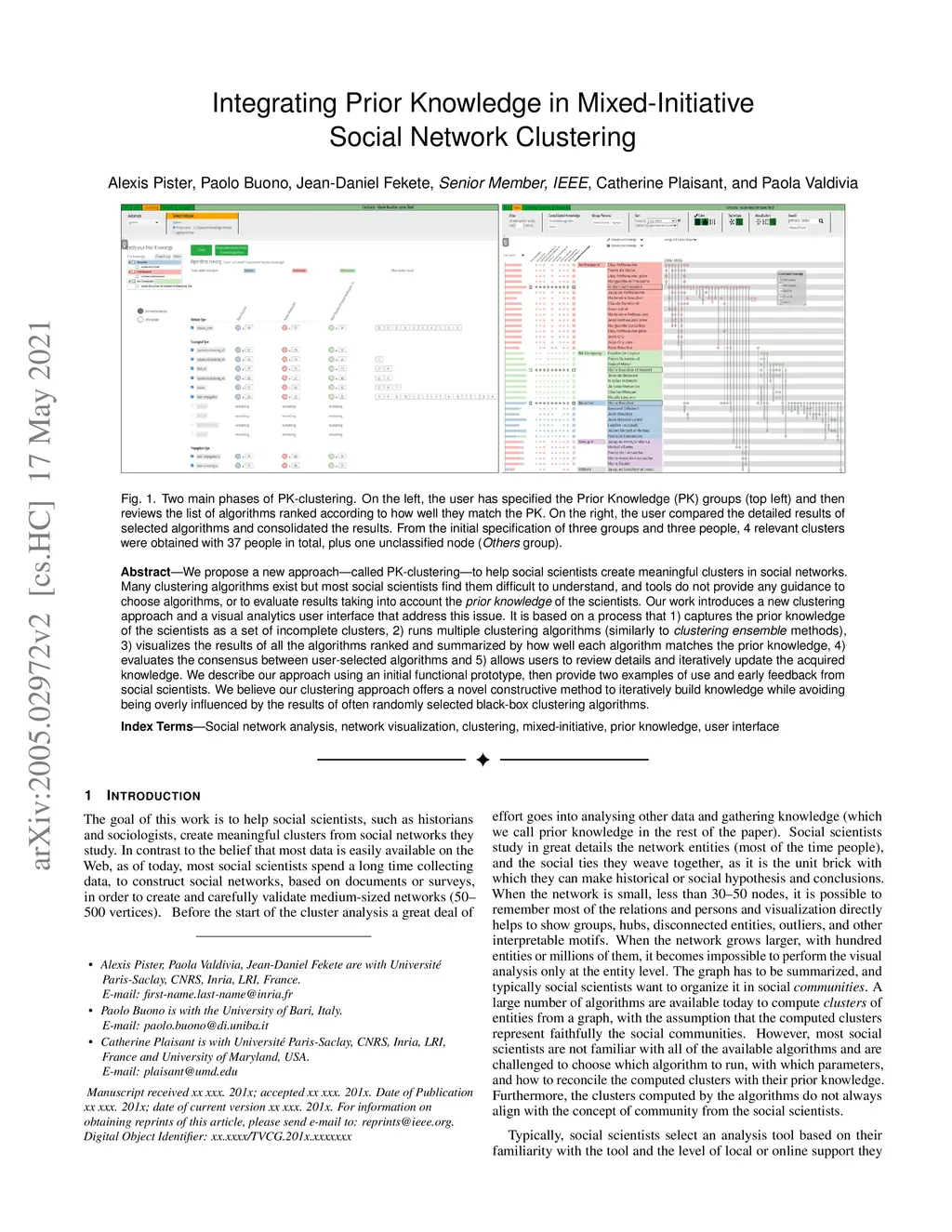 We propose a new approach -- called PK-clustering -- to help social scientists create meaningful clusters in social networks. Many clustering algorithms exist but most social scientists find them difficult to understand, and tools do not provide any guidance to choose algorithms, or to evaluate results taking into account the prior knowledge of the scientists. Our work introduces a new clustering approach and a visual analytics user interface that address this issue. It is based on a process that 1) captures the prior knowledge of the scientists as a set of incomplete clusters, 2) runs multiple clustering algorithms (similarly to clustering ensemble methods), 3) visualizes the results of all the algorithms ranked and summarized by how well each algorithm matches the prior knowledge, 4) evaluates the consensus between user-selected algorithms, and 5) allows users to review details and iteratively update the acquired knowledge. We describe our approach using an initial functional prototype, then provide two examples of use and early feedback from social scientists. We believe our clustering approach offers a novel constructive method to iteratively build knowledge while avoiding being overly influenced by the results of often randomly selected black-box clustering algorithms.