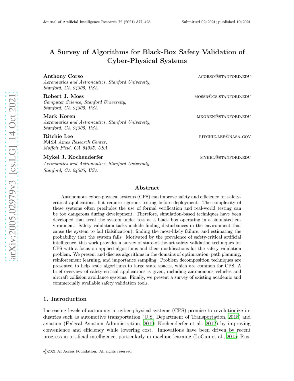 Autonomous cyber-physical systems (CPS) can improve safety and efficiency for safety-critical applications, but require rigorous testing before deployment. The complexity of these systems often precludes the use of formal verification and real-world testing can be too dangerous during development. Therefore, simulation-based techniques have been developed that treat the system under test as a black box operating in a simulated environment. Safety validation tasks include finding disturbances in the environment that cause the system to fail (falsification), finding the most-likely failure, and estimating the probability that the system fails. Motivated by the prevalence of safety-critical artificial intelligence, this work provides a survey of state-of-the-art safety validation techniques for CPS with a focus on applied algorithms and their modifications for the safety validation problem. We present and discuss algorithms in the domains of optimization, path planning, reinforcement learning, and importance sampling. Problem decomposition techniques are presented to help scale algorithms to large state spaces, which are common for CPS. A brief overview of safety-critical applications is given, including autonomous vehicles and aircraft collision avoidance systems. Finally, we present a survey of existing academic and commercially available safety validation tools.