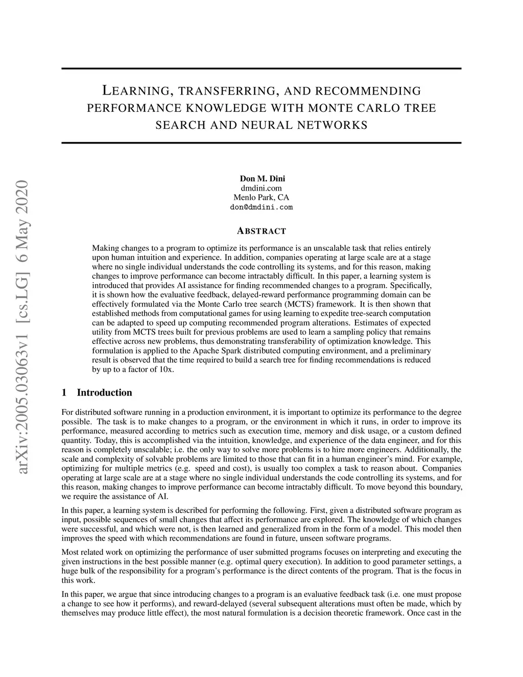 Making changes to a program to optimize its performance is an unscalable task that relies entirely upon human intuition and experience. In addition, companies operating at large scale are at a stage where no single individual understands the code controlling its systems, and for this reason, making changes to improve performance can become intractably difficult. In this paper, a learning system is introduced that provides AI assistance for finding recommended changes to a program. Specifically, it is shown how the evaluative feedback, delayed-reward performance programming domain can be effectively formulated via the Monte Carlo tree search (MCTS) framework. It is then shown that established methods from computational games for using learning to expedite tree-search computation can be adapted to speed up computing recommended program alterations. Estimates of expected utility from MCTS trees built for previous problems are used to learn a sampling policy that remains effective across new problems, thus demonstrating transferability of optimization knowledge. This formulation is applied to the Apache Spark distributed computing environment, and a preliminary result is observed that the time required to build a search tree for finding recommendations is reduced by up to a factor of 10x.