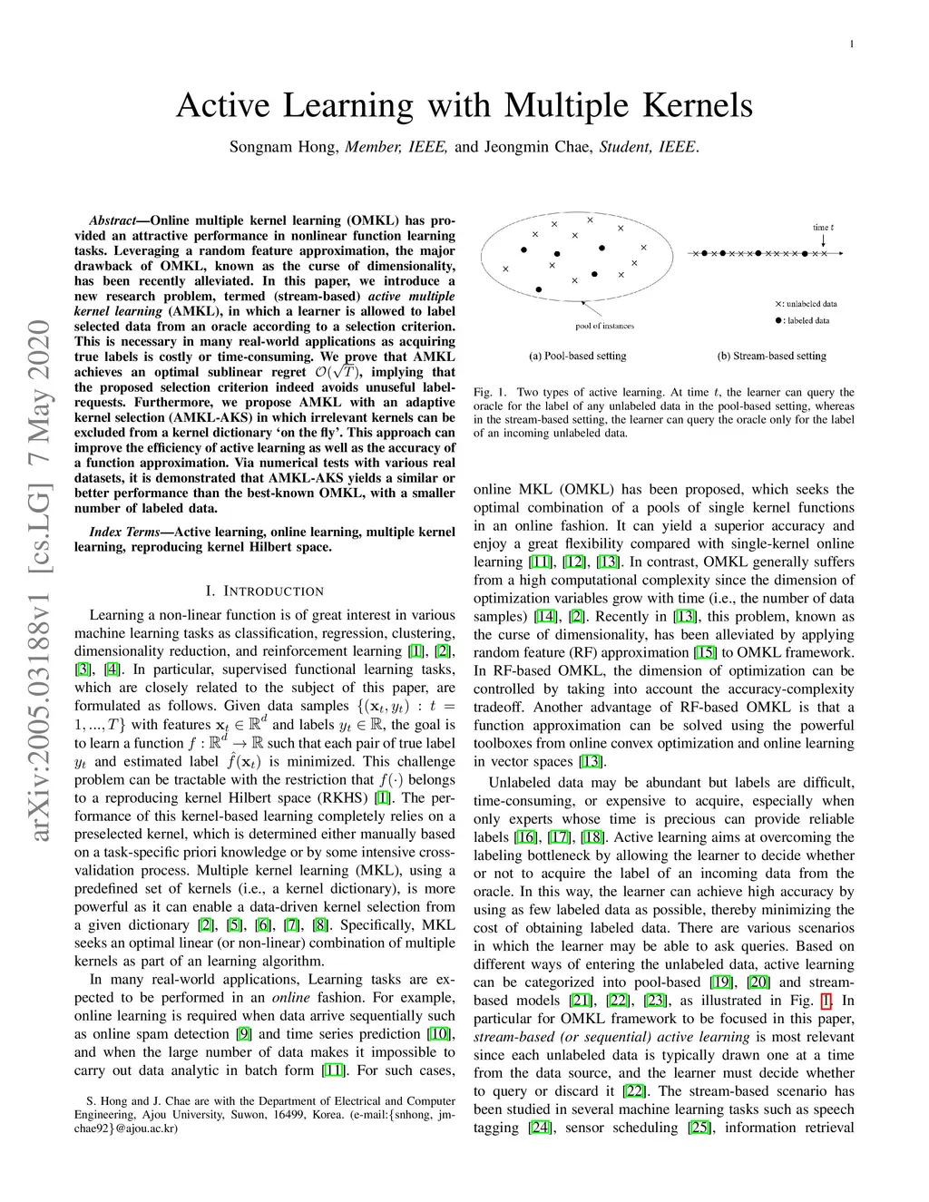 Online multiple kernel learning (OMKL) has provided an attractive performance in nonlinear function learning tasks. Leveraging a random feature approximation, the major drawback of OMKL, known as the curse of dimensionality, has been recently alleviated. In this paper, we introduce a new research problem, termed (stream-based) active multiple kernel learning (AMKL), in which a learner is allowed to label selected data from an oracle according to a selection criterion. This is necessary in many real-world applications as acquiring true labels is costly or time-consuming. We prove that AMKL achieves an optimal sublinear regret, implying that the proposed selection criterion indeed avoids unuseful label-requests. Furthermore, we propose AMKL with an adaptive kernel selection (AMKL-AKS) in which irrelevant kernels can be excluded from a kernel dictionary ón the fly'. This approach can improve the efficiency of active learning as well as the accuracy of a function approximation. Via numerical tests with various real datasets, it is demonstrated that AMKL-AKS yields a similar or better performance than the best-known OMKL, with a smaller number of labeled data.