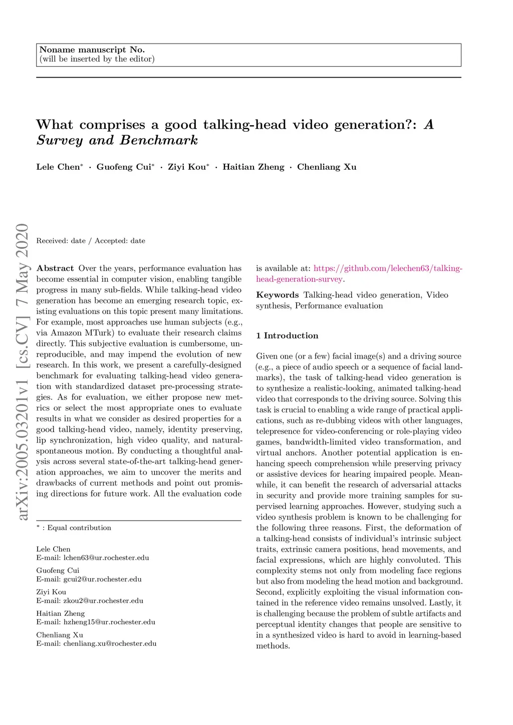 Over the years, performance evaluation has become essential in computer vision, enabling tangible progress in many sub-fields. While talking-head video generation has become an emerging research topic, existing evaluations on this topic present many limitations. For example, most approaches use human subjects (e.g., via Amazon MTurk) to evaluate their research claims directly. This subjective evaluation is cumbersome, unreproducible, and may impend the evolution of new research. In this work, we present a carefully-designed benchmark for evaluating talking-head video generation with standardized dataset pre-processing strategies. As for evaluation, we either propose new metrics or select the most appropriate ones to evaluate results in what we consider as desired properties for a good talking-head video, namely, identity preserving, lip synchronization, high video quality, and natural-spontaneous motion. By conducting a thoughtful analysis across several state-of-the-art talking-head generation approaches, we aim to uncover the merits and drawbacks of current methods and point out promising directions for future work. All the evaluation code is available at: https://github.com/lelechen63/talking-head-generation-survey.