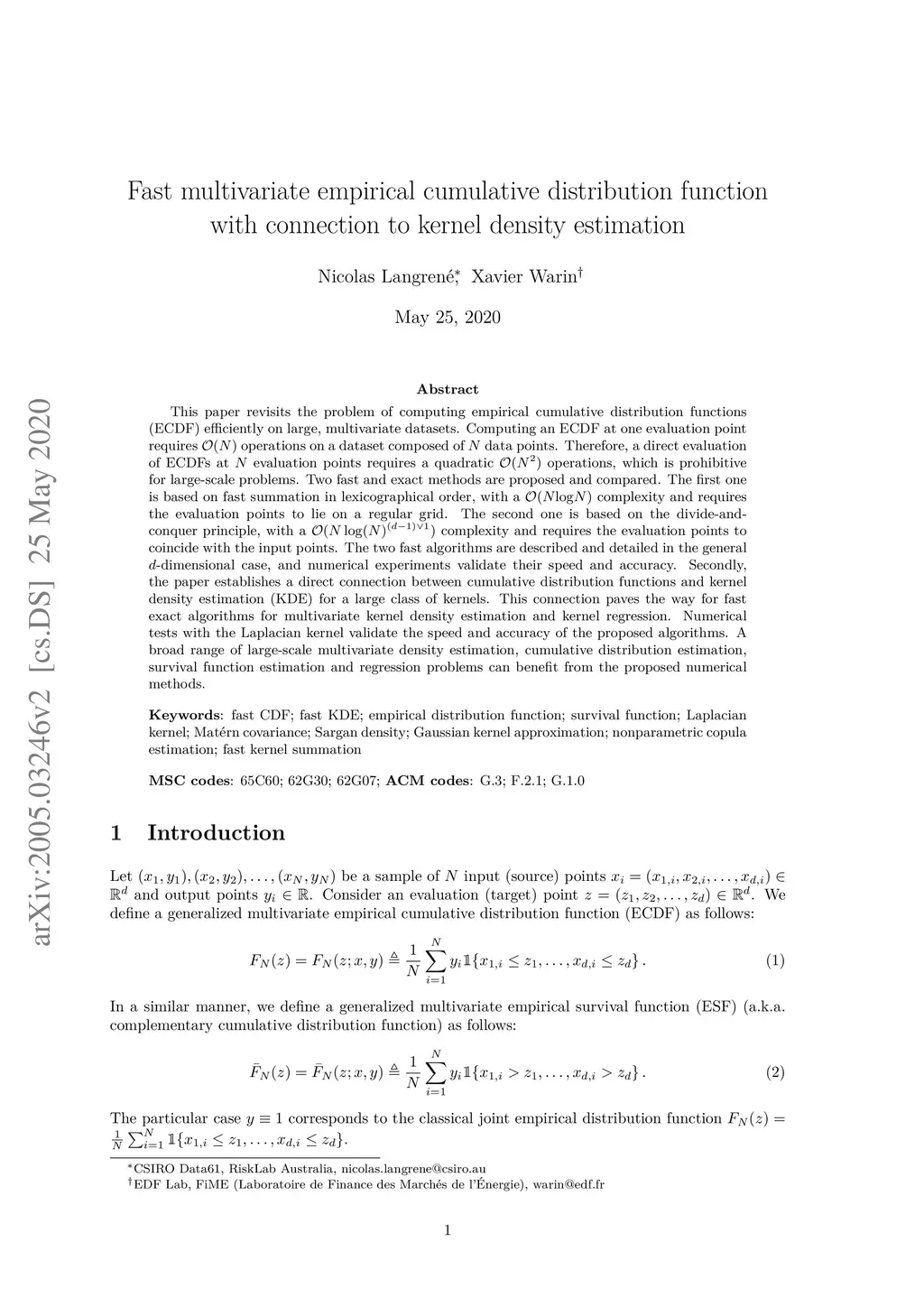This paper revisits the problem of computing empirical cumulative distribution functions (ECDF) efficiently on large, multivariate datasets. Computing an ECDF at one evaluation point requires operations on a dataset composed of data points. Therefore, a direct evaluation of ECDFs at evaluation points requires a quadratic operations, which is prohibitive for large-scale problems. Two fast and exact methods are proposed and compared. The first one is based on fast summation in lexicographical order, with a complexity and requires the evaluation points to lie on a regular grid. The second one is based on the divide-and-conquer principle, with a complexity and requires the evaluation points to coincide with the input points. The two fast algorithms are described and detailed in the general -dimensional case, and numerical experiments validate their speed and accuracy. Secondly, the paper establishes a direct connection between cumulative distribution functions and kernel density estimation (KDE) for a large class of kernels. This connection paves the way for fast exact algorithms for multivariate kernel density estimation and kernel regression. Numerical tests with the Laplacian kernel validate the speed and accuracy of the proposed algorithms. A broad range of large-scale multivariate density estimation, cumulative distribution estimation, survival function estimation and regression problems can benefit from the proposed numerical methods.