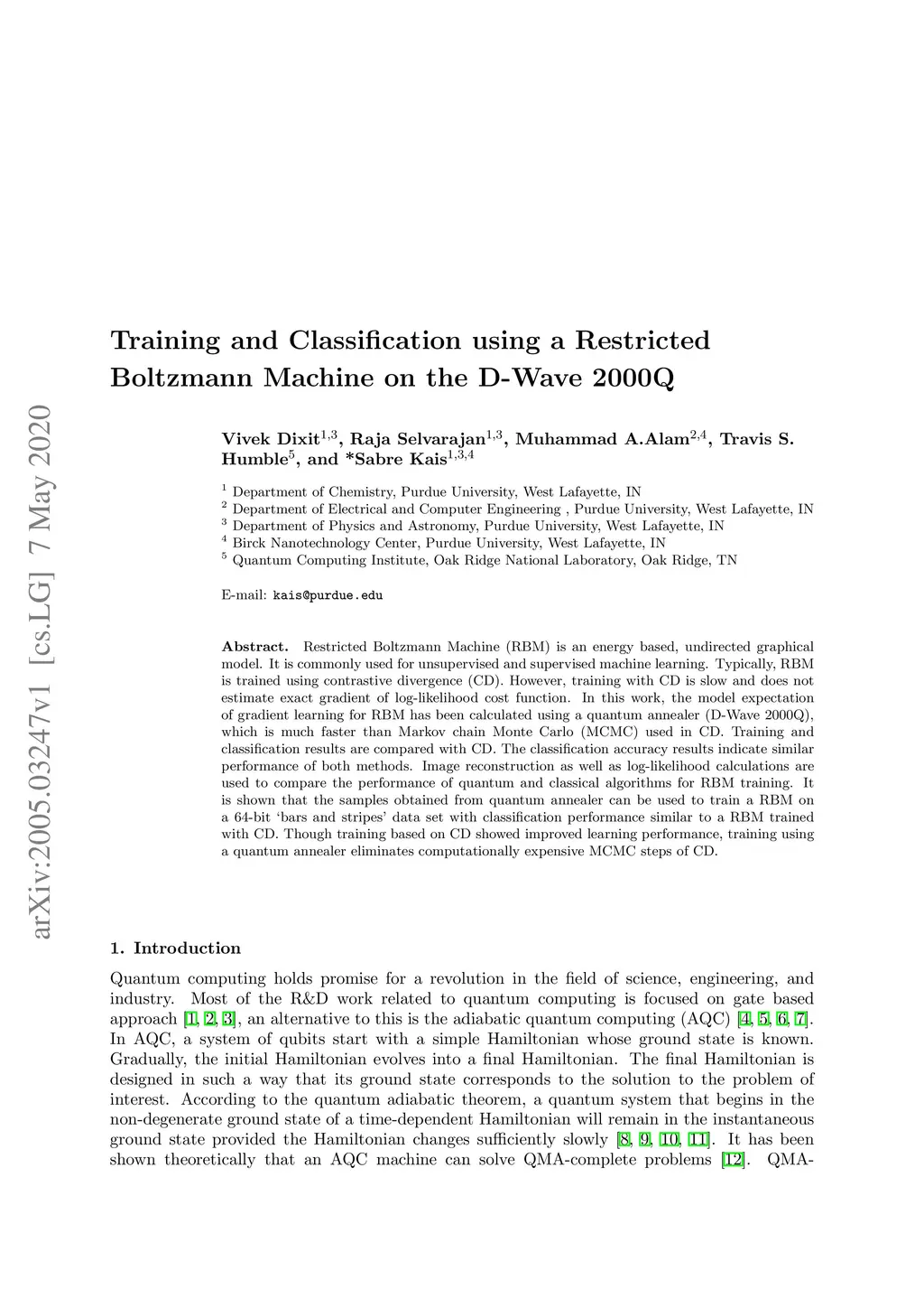 Restricted Boltzmann Machine (RBM) is an energy based, undirected graphical model. It is commonly used for unsupervised and supervised machine learning. Typically, RBM is trained using contrastive divergence (CD). However, training with CD is slow and does not estimate exact gradient of log-likelihood cost function. In this work, the model expectation of gradient learning for RBM has been calculated using a quantum annealer (D-Wave 2000Q), which is much faster than Markov chain Monte Carlo (MCMC) used in CD. Training and classification results are compared with CD. The classification accuracy results indicate similar performance of both methods. Image reconstruction as well as log-likelihood calculations are used to compare the performance of quantum and classical algorithms for RBM training. It is shown that the samples obtained from quantum annealer can be used to train a RBM on a 64-bit `bars and stripes' data set with classification performance similar to a RBM trained with CD. Though training based on CD showed improved learning performance, training using a quantum annealer eliminates computationally expensive MCMC steps of CD.
