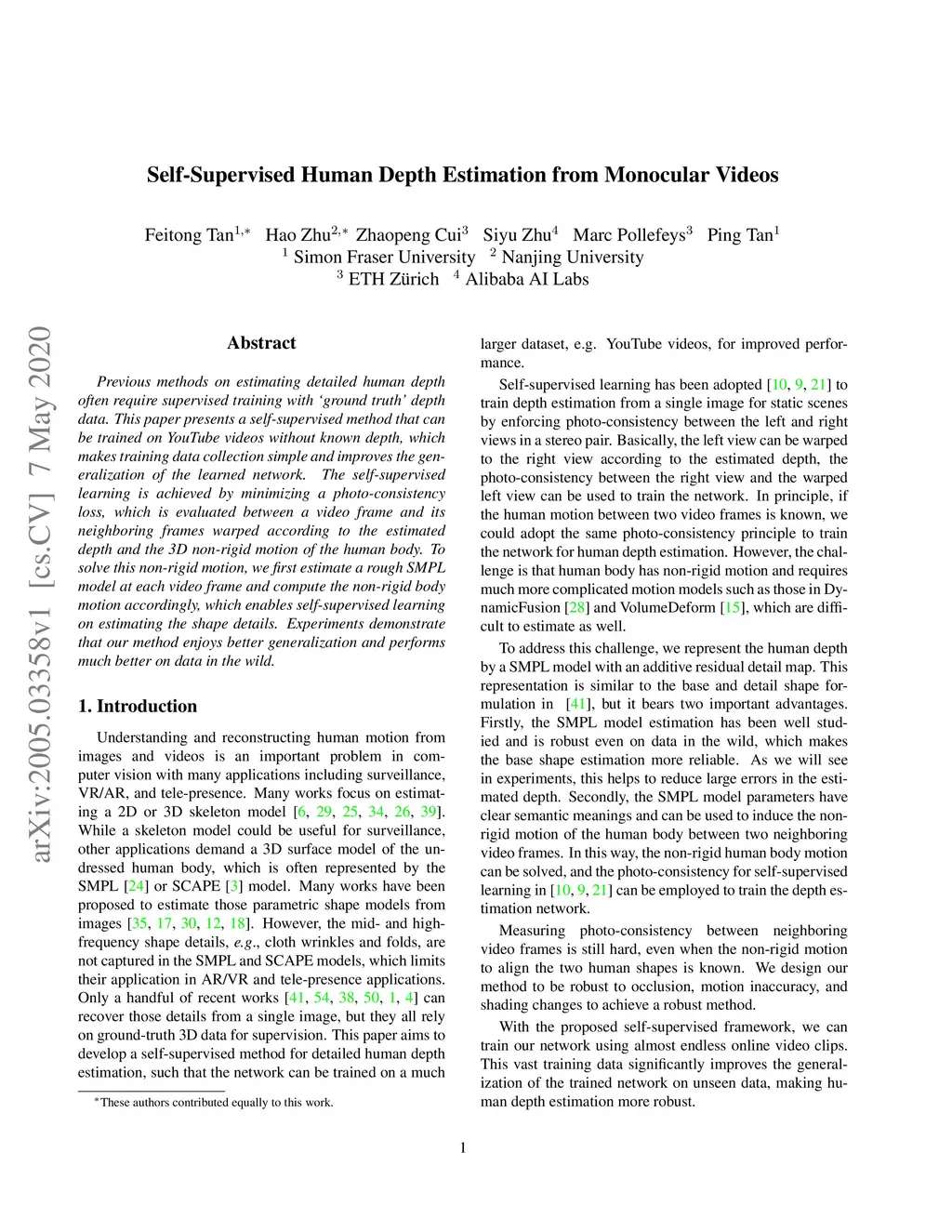 Previous methods on estimating detailed human depth often require supervised training with `ground truth' depth data. This paper presents a self-supervised method that can be trained on YouTube videos without known depth, which makes training data collection simple and improves the generalization of the learned network. The self-supervised learning is achieved by minimizing a photo-consistency loss, which is evaluated between a video frame and its neighboring frames warped according to the estimated depth and the 3D non-rigid motion of the human body. To solve this non-rigid motion, we first estimate a rough SMPL model at each video frame and compute the non-rigid body motion accordingly, which enables self-supervised learning on estimating the shape details. Experiments demonstrate that our method enjoys better generalization and performs much better on data in the wild.