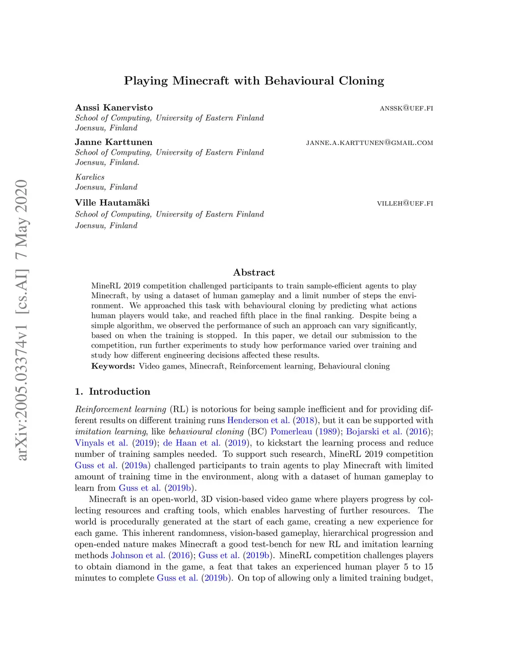 MineRL 2019 competition challenged participants to train sample-efficient agents to play Minecraft, by using a dataset of human gameplay and a limit number of steps the environment. We approached this task with behavioural cloning by predicting what actions human players would take, and reached fifth place in the final ranking. Despite being a simple algorithm, we observed the performance of such an approach can vary significantly, based on when the training is stopped. In this paper, we detail our submission to the competition, run further experiments to study how performance varied over training and study how different engineering decisions affected these results.