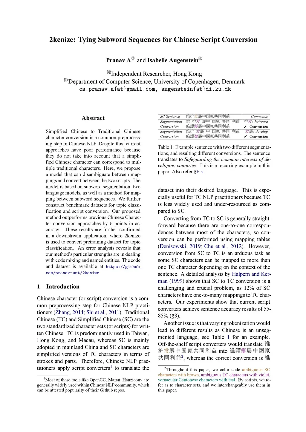 Simplified Chinese to Traditional Chinese character conversion is a common preprocessing step in Chinese NLP. Despite this, current approaches have poor performance because they do not take into account that a simplified Chinese character can correspond to multiple traditional characters. Here, we propose a model that can disambiguate between mappings and convert between the two scripts. The model is based on subword segmentation, two language models, as well as a method for mapping between subword sequences. We further construct benchmark datasets for topic classification and script conversion. Our proposed method outperforms previous Chinese Character conversion approaches by 6 points in accuracy. These results are further confirmed in a downstream application, where 2kenize is used to convert pretraining dataset for topic classification. An error analysis reveals that our method's particular strengths are in dealing with code-mixing and named entities.
