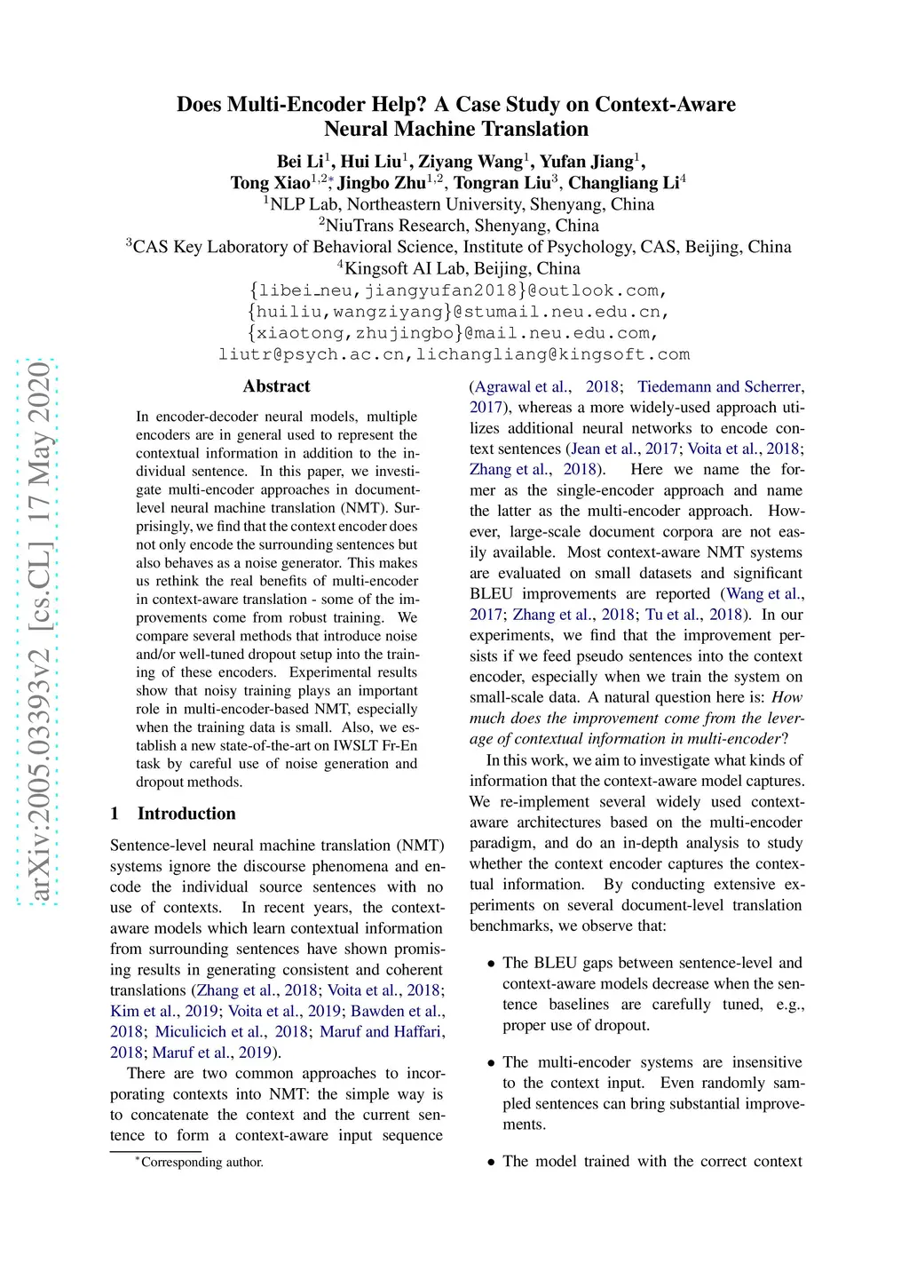 In encoder-decoder neural models, multiple encoders are in general used to represent the contextual information in addition to the individual sentence. In this paper, we investigate multi-encoder approaches in documentlevel neural machine translation (NMT). Surprisingly, we find that the context encoder does not only encode the surrounding sentences but also behaves as a noise generator. This makes us rethink the real benefits of multi-encoder in context-aware translation - some of the improvements come from robust training. We compare several methods that introduce noise and/or well-tuned dropout setup into the training of these encoders. Experimental results show that noisy training plays an important role in multi-encoder-based NMT, especially when the training data is small. Also, we establish a new state-of-the-art on IWSLT Fr-En task by careful use of noise generation and dropout methods.