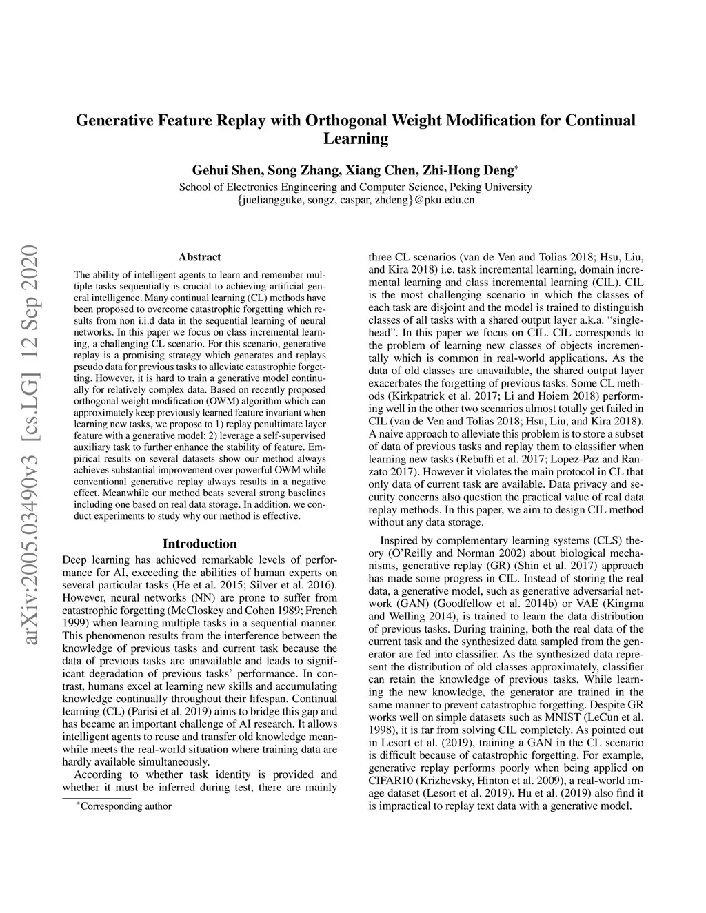 The ability of intelligent agents to learn and remember multiple tasks sequentially is crucial to achieving artificial general intelligence. Many continual learning (CL) methods have been proposed to overcome catastrophic forgetting which results from non i.i.d data in the sequential learning of neural networks. In this paper we focus on class incremental learning, a challenging CL scenario. For this scenario, generative replay is a promising strategy which generates and replays pseudo data for previous tasks to alleviate catastrophic forgetting. However, it is hard to train a generative model continually for relatively complex data. Based on recently proposed orthogonal weight modification (OWM) algorithm which can approximately keep previously learned feature invariant when learning new tasks, we propose to 1) replay penultimate layer feature with a generative model; 2) leverage a self-supervised auxiliary task to further enhance the stability of feature. Empirical results on several datasets show our method always achieves substantial improvement over powerful OWM while conventional generative replay always results in a negative effect. Meanwhile our method beats several strong baselines including one based on real data storage. In addition, we conduct experiments to study why our method is effective.