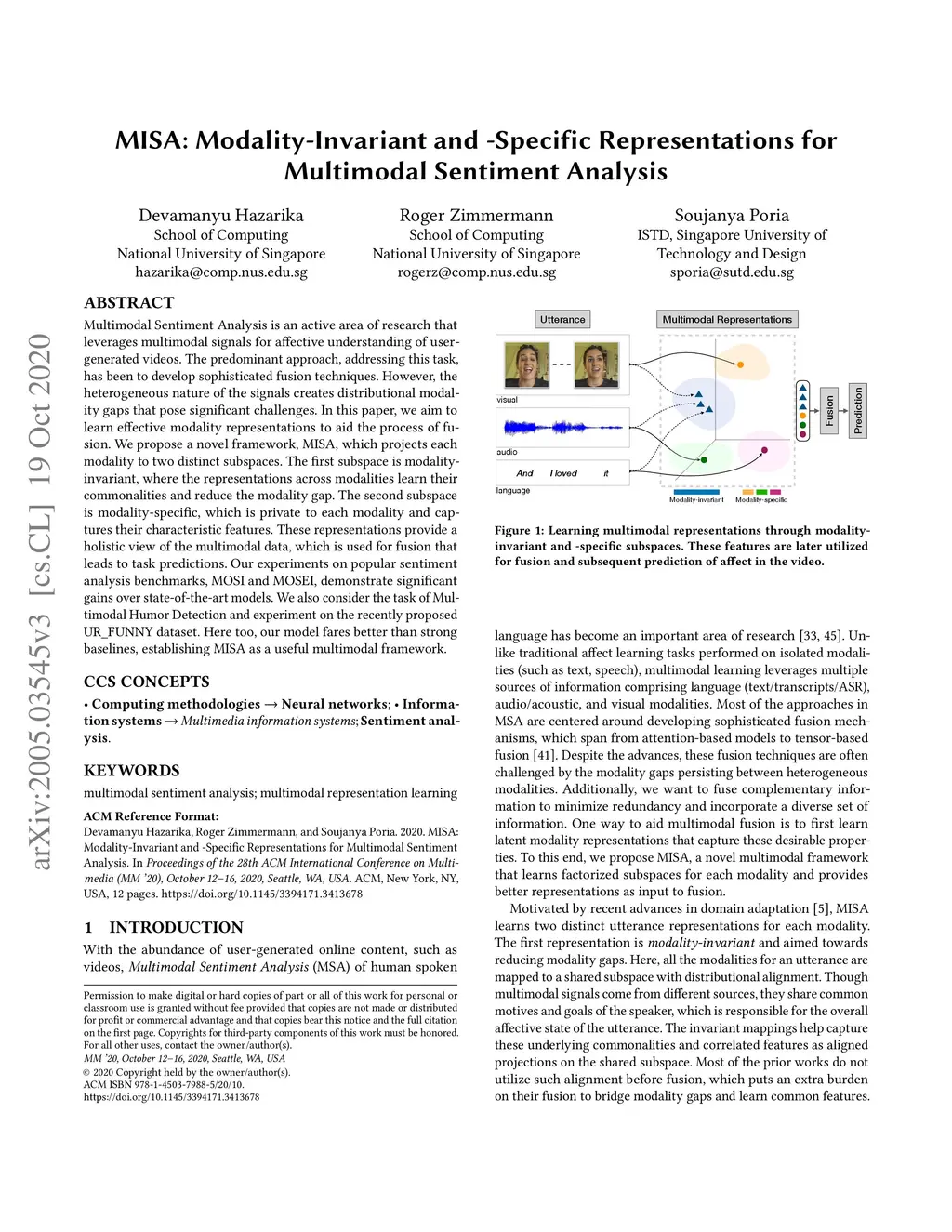 MISA: Modality-Invariant and -Specific Representations for Multimodal