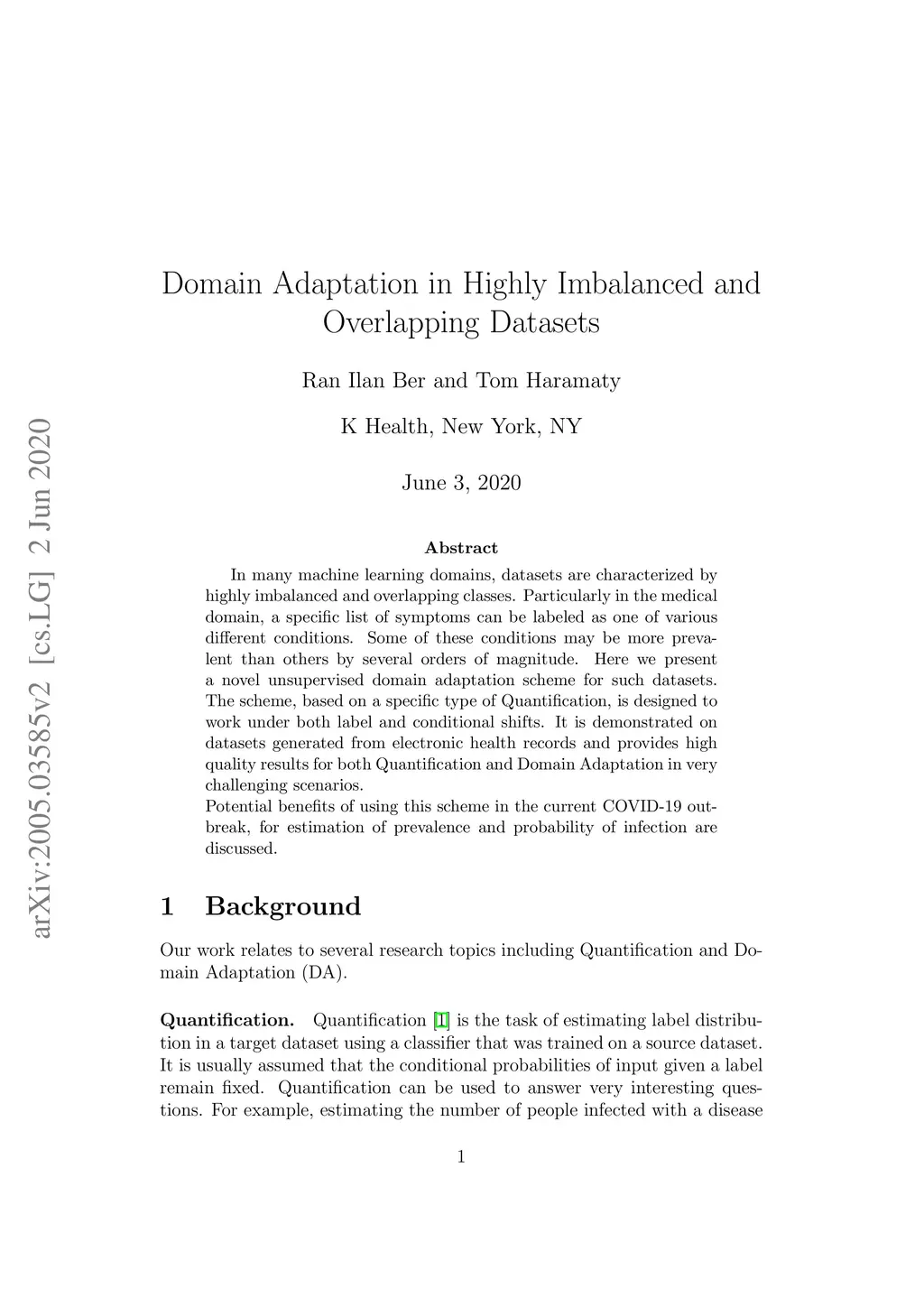 In many machine learning domains, datasets are characterized by highly imbalanced and overlapping classes. Particularly in the medical domain, a specific list of symptoms can be labeled as one of various different conditions. Some of these conditions may be more prevalent than others by several orders of magnitude. Here we present a novel unsupervised domain adaptation scheme for such datasets. The scheme, based on a specific type of Quantification, is designed to work under both label and conditional shifts. It is demonstrated on datasets generated from electronic health records and provides high quality results for both Quantification and Domain Adaptation in very challenging scenarios. Potential benefits of using this scheme in the current COVID-19 outbreak, for estimation of prevalence and probability of infection are discussed.